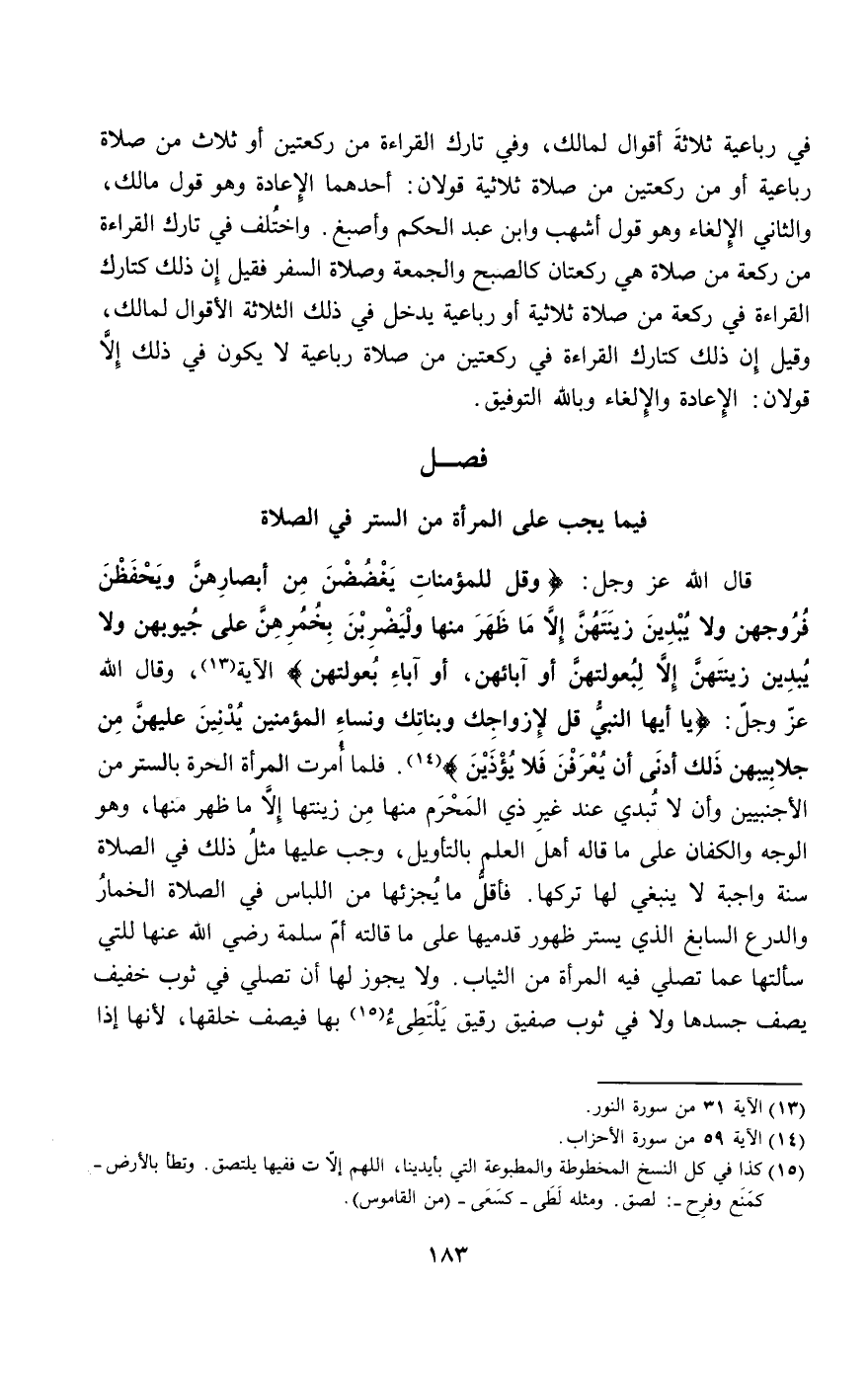 قال الله عز وجل: {وَقُلْ لِلْمُؤْمِنَاتِ يَغْضُضْنَ مِنْ أَبْصَارِهِنَّ وَيَحْفَظْنَ فُرُوجَهُنَّ وَلا يُبْدِينَ زِينَتَهُنَّ إِلا مَا ظَهَرَ مِنْهَا وَلْيَضْرِبْنَ بِخُمُرِهِنَّ عَلَى جُيُوبِهِنَّ وَلا يُبْدِينَ زِينَتَهُنَّ إِلا لِبُعُولَتِهِنَّ أَوْ آبَائِهِنَّ أَوْ آبَاءِ بُعُولَتِهِنَّ} [النور: 31] الآية، وقال الله عز وجل: {يَا أَيُّهَا النَّبِيُّ قُلْ لأَزْوَاجِكَ وَبَنَاتِكَ وَنِسَاءِ الْمُؤْمِنِينَ يُدْنِينَ عَلَيْهِنَّ مِنْ جَلابِيبِهِنَّ ذَلِكَ أَدْنَى أَنْ يُعْرَفْنَ فَلا يُؤْذَيْنَ} [الأحزاب: 59]. فلما أمرت المرأة الحرة بالستر من الأجنبيين، وأن لا تبدي عند غير ذي المحرم منها من زينتها إلا ما ظهر منها، وهو الوجه والكفان على ما قاله أهل العلم بالتأويل، وجب عليها مثل ذلك في الصلاة سنة واجبة لا ينبغي لها تركها. فأقل ما يجزئها من اللباس في الصلاة الخمار والدرع السابغ الذي يستر ظهور قدميها على ما قالته أم سلمة - رَضِيَ اللَّهُ عَنْهَا - للتي سألتها عما تصلي فيه المرأة من الثياب. ولا يجوز لها أن تصلي في ثوب خفيف يصف جسدها، ولا في ثوب صفيق رقيق يلتطئ بها فيصف خلقها؛ لأنها إذا