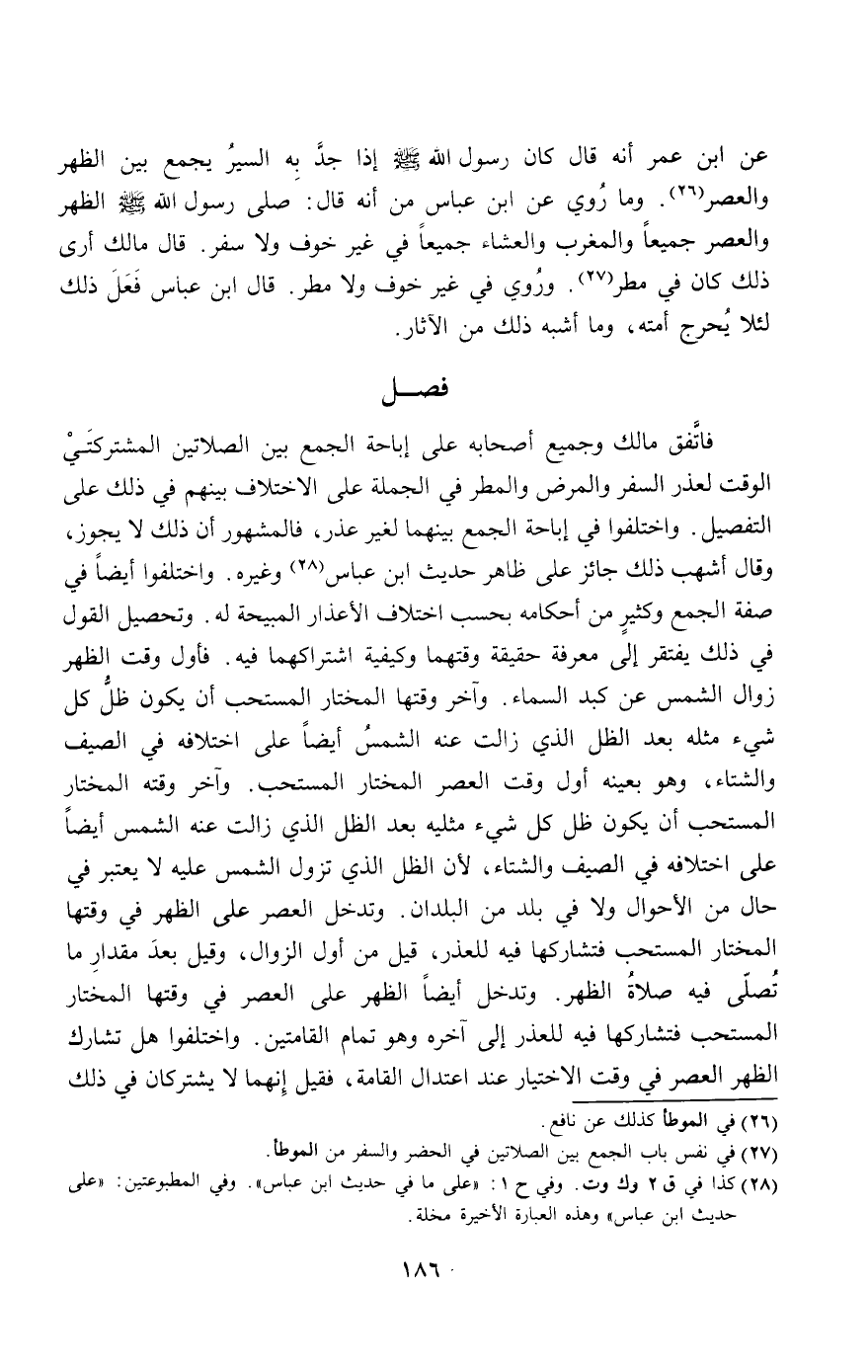عن ابن عمر أنه قال: «كان رسول الله - صَلَّى اللَّهُ عَلَيْهِ وَسَلَّمَ - إذا جد به السير يجمع بين الظهر والعصر». وما روي عن ابن عباس من أنه قال: «صلى رسول الله - صَلَّى اللَّهُ عَلَيْهِ وَسَلَّمَ - الظهر والعصر جميعا، والمغرب والعشاء جميعا في غير خوف ولا سفر.» قال مالك: أرى ذلك كان في مطر. وروي في غير خوف ولا مطر. قال ابن عباس: فعل ذلك لئلا يحرج أمته، وما أشبه ذلك من الآثار.