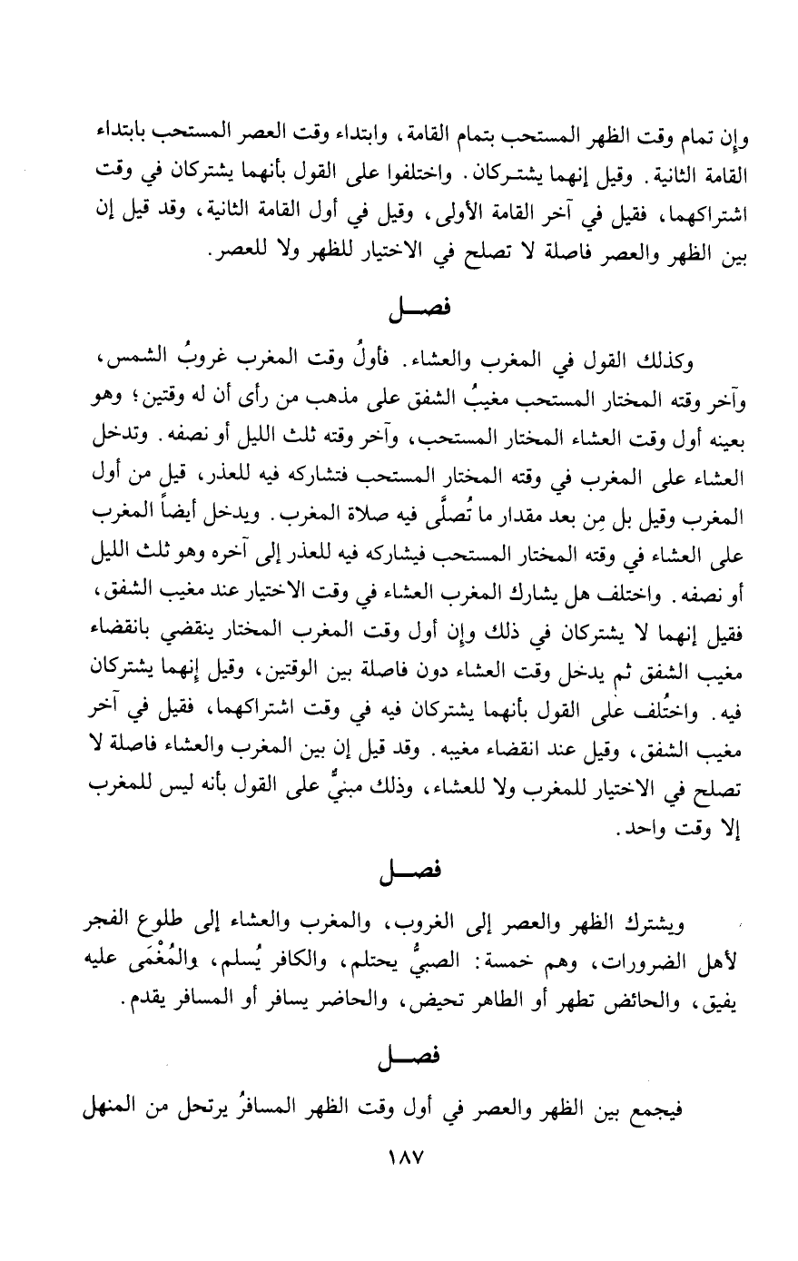 ويشترك الظهر والعصر إلى الغروب، والمغرب والعشاء إلى طلوع الفجر لأهل الضرورات، وهم خمسة: الصبي يحتلم، والكافر يسلم، والمغمى عليه يفيق، والحائض تطهر أو الطاهر تحيض، والحاضر يسافر أو المسافر يقدم.