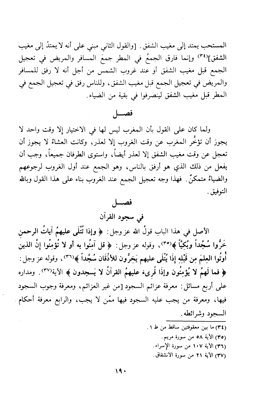 الأصل في هذا الباب قول الله عز وجل: {إِذَا تُتْلَى عَلَيْهِمْ آيَاتُ الرَّحْمَنِ خَرُّوا سُجَّدًا وَبُكِيًّا} [مريم: 58]، وقوله عز وجل: {قُلْ آمِنُوا بِهِ أَوْ لا تُؤْمِنُوا إِنَّ الَّذِينَ أُوتُوا الْعِلْمَ مِنْ قَبْلِهِ إِذَا يُتْلَى عَلَيْهِمْ يَخِرُّونَ لِلأَذْقَانِ سُجَّدًا} [الإسراء: 107]، وقوله عز وجل: {فَمَا لَهُمْ لا يُؤْمِنُونَ} [الانشقاق: 20] {وَإِذَا قُرِئَ عَلَيْهِمُ الْقُرْآنُ لا يَسْجُدُونَ} [الانشقاق: 21] الآية. ومداره على أربع مسائل: معرفة عزائم السجود [من غير العزائم، ومعرفة وجوب السجود فيها، ومعرفة من يجب عليه السجود فيها ممن لا يجب، والرابع معرفة أحكام السجود وشرائطه.