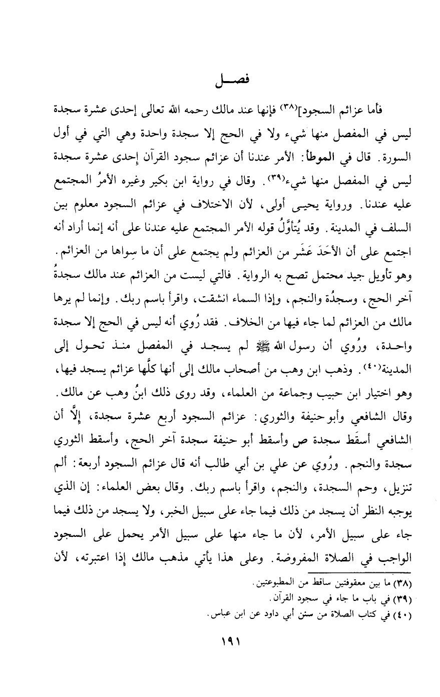 فأما عزائم السجود] فإنها عند مالك - رَحِمَهُ اللَّهُ تَعَالَى - إحدى عشرة سجدة ليس في المفصل منها شيء، ولا في الحج إلا سجدة واحدة، وهي التي في أول السورة. قال في الموطأ: الأمر عندنا أن عزائم سجود القرآن إحدى عشرة سجدة ليس في المفصل منها شيء. وقال في رواية ابن بكير وغيره: الأمر المجتمع عليه عندنا. ورواية يحيى أولى؛ لأن الاختلاف في عزائم السجود معلوم بين السلف في المدينة. وقد يتأول قوله: الأمر المجتمع عليه عندنا، على أنه إنما أراد أنه اجتمع على أن الأحد عشر من العزائم ولم يجتمع على أن ما سواها من العزائم. وهو تأويل جيد محتمل تصح به الرواية. فالتي ليست من العزائم عند مالك سجدة آخر الحج، وسجدة والنجم، {إِذَا السَّمَاءُ انْشَقَّتْ} [الانشقاق: 1] و {اقْرَأْ بِاسْمِ رَبِّكَ} [العلق: 1]. وإنما لم يرها مالك من العزائم لما جاء فيها من الخلاف. فقد روي أنه ليس في الحج إلا سجدة واحدة، وروي «أن رسول الله - صَلَّى اللَّهُ عَلَيْهِ وَسَلَّمَ - لم يسجد في المفصل منذ تحول إلى المدينة». وذهب ابن وهب من أصحاب مالك إلى أنها كلها عزائم يسجد فيها، وهو اختيار ابن حبيب وجماعة من العلماء، وقد روى ذلك ابن وهب عن مالك. وقال الشافعي وأبو حنيفة والثوري: عزائم السجود أربع عشرة سجدة، إلا أن الشافعي أسقط سجدة ص وأسقط أبو حنيفة سجدة آخر الحج، وأسقط الثوري سجدة والنجم. وروي عن علي بن أبي طالب أنه قال: عزائم السجود أربعة: ألم تنزيل، وحم السجدة، والنجم، واقرأ باسم ربك. وقال بعض العلماء: إن الذي يوجبه النظر أن يسجد من ذلك فيما جاء على سبيل الخبر، ولا يسجد من ذلك فيما جاء على سبيل الأمر؛ لأن ما جاء منها على سبيل الأمر يحمل على السجود الواجب في الصلاة المفروضة. وعلى هذا يأتي مذهب مالك إذا اعتبرته؛ لأن