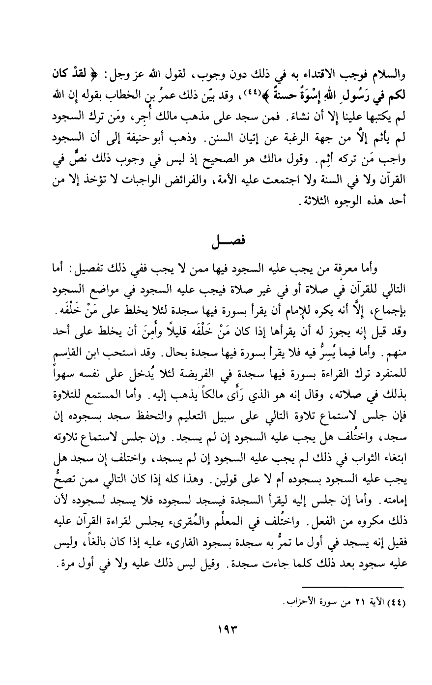 والسلام فوجب الاقتداء به في ذلك دون وجوب؛ لقول الله عز وجل: {لَقَدْ كَانَ لَكُمْ فِي رَسُولِ اللَّهِ أُسْوَةٌ حَسَنَةٌ} [الأحزاب: 21]، وقد بين ذلك عمر بن الخطاب بقوله إن الله لم يكتبها علينا إلا أن نشاء. فمن سجد على مذهب مالك أجر، ومن ترك السجود لم يأثم إلا من جهة الرغبة عن إتيان السنن. وذهب أبو حنيفة إلى أن السجود واجب من تركه أثم. وقول مالك هو الصحيح إذ ليس في وجوب ذلك نص في القرآن ولا في السنة ولا اجتمعت عليه الأمة، والفرائض الواجبات لا تؤخذ إلا من أحد هذه الوجوه الثلاثة.