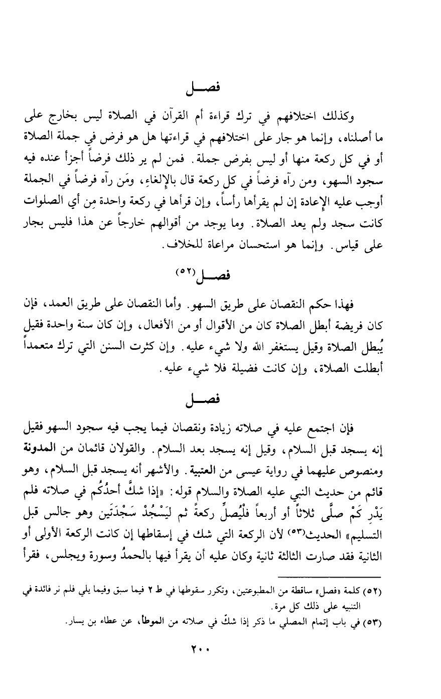 وكذلك اختلافهم في ترك قراءة أم القرآن في الصلاة ليس بخارج على ما أصلناه، وإنما هو جار على اختلافهم في قراءتها هل هو فرض في جملة الصلاة أو في كل ركعة منها أو ليس بفرض جملة. فمن لم ير ذلك فرضا أجزأ عنده فيه سجود السهو، ومن رآه فرضا في كل ركعة قال بالإلغاء، ومن رآه فرضا في الجملة أوجب عليه الإعادة إن لم يقرأها رأسا، وإن قرأها في ركعة واحدة من أي الصلوات كانت سجد ولم يعد الصلاة. وما يوجد من أقوالهم خارجا عن هذا فليس بجار على قياس. وإنما هو استحسان مراعاة للخلاف.