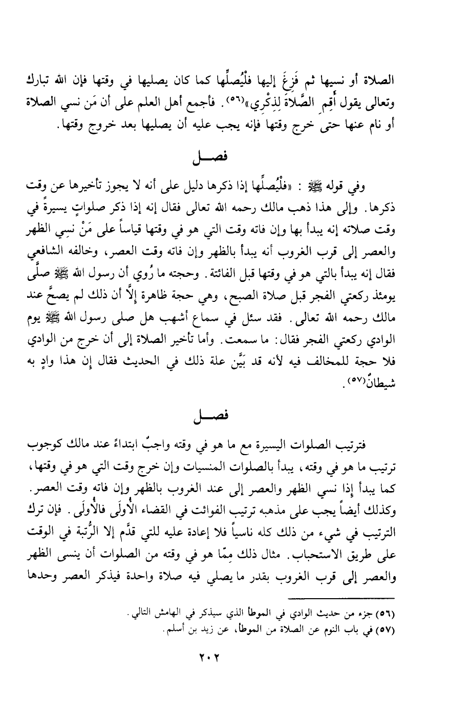 وفي قوله - صَلَّى اللَّهُ عَلَيْهِ وَسَلَّمَ -: «فليصلها إذا ذكرها» دليل على أنه لا يجوز تأخيرها عن وقت ذكرها. وإلى هذا ذهب مالك - رَحِمَهُ اللَّهُ تَعَالَى - فقال: إنه إذا ذكر صلوات يسيرة في وقت صلاته إنه يبدأ بها وإن فاته وقت التي هو في وقتها، قياسا على من نسي الظهر والعصر إلى قرب الغروب أنه يبدأ بالظهر وإن فاته وقت العصر، وخالفه الشافعي فقال: إنه يبدأ بالتي هو في وقتها قبل الفائتة. وحجته ما روي أن رسول الله - صَلَّى اللَّهُ عَلَيْهِ وَسَلَّمَ - صلى يومئذ ركعتي الفجر قبل صلاة الصبح، وهي حجة ظاهرة إلا أن ذلك لم يصح عند مالك - رَحِمَهُ اللَّهُ تَعَالَى -. فقد سئل في سماع أشهب هل صلى رسول الله - صَلَّى اللَّهُ عَلَيْهِ وَسَلَّمَ - يوم الوادي ركعتي الفجر، فقال: ما سمعت. وأما تأخير الصلاة إلى أن خرج من الوادي فلا حجة للمخالف فيه؛ لأنه قد بين علة ذلك في الحديث فقال: إن هذا واد به شيطان.