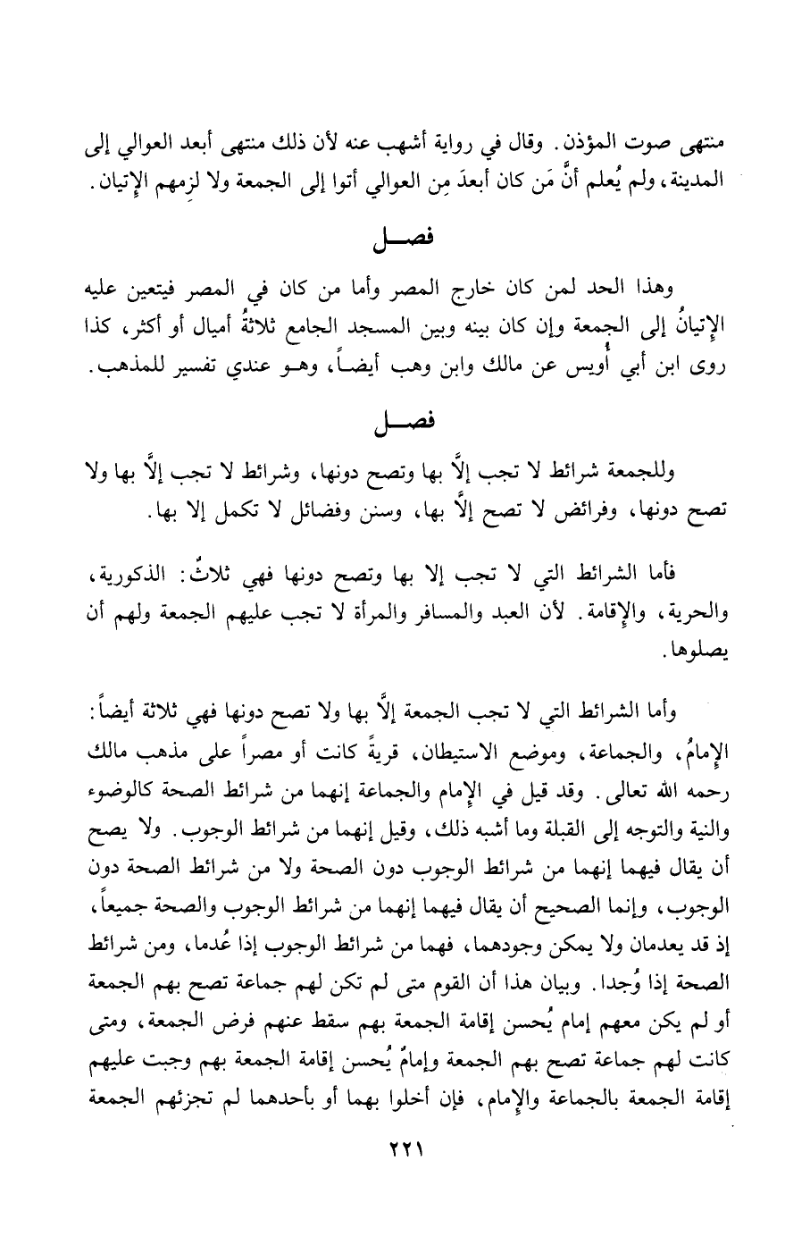 وأما الشرائط التي لا تجب الجمعة إلا بها ولا تصح دونها فهي ثلاثة أيضا: الإمام، والجماعة، وموضع الاستيطان، قرية كانت أو مصرا على مذهب مالك - رَحِمَهُ اللَّهُ تَعَالَى -. وقد قيل في الإمام والجماعة: إنهما من شرائط الصحة كالوضوء والنية والتوجه إلى القبلة وما أشبه ذلك، وقيل: إنهما من شرائط الوجوب. ولا يصح أن يقال فيهما: إنهما من شرائط الوجوب دون الصحة ولا من شرائط الصحة دون الوجوب، وإنما الصحيح أن يقال فيهما: إنهما من شرائط الوجوب والصحة جميعا، إذ قد يعدمان ولا يمكن وجودهما، فهما من شرائط الوجوب إذا عدما، ومن شرائط الصحة إذا وجدا. وبيان هذا أن القوم متى لم تكن لهم جماعة تصح بهم الجمعة أو لم يكن معهم إمام يحسن إقامة الجمعة بهم سقط عنهم فرض الجمعة، ومتى كانت لهم جماعة تصح بهم الجمعة وإمام يحسن إقامة الجمعة بهم وجبت عليهم إقامة الجمعة بالجماعة والإمام، فإن أخلوا بهما أو بأحدهما لم تجزئهم الجمعة