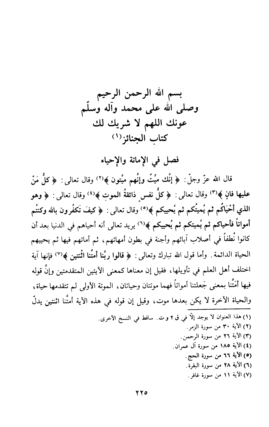 قال الله عز وجل: {إِنَّكَ مَيِّتٌ وَإِنَّهُمْ مَيِّتُونَ} [الزمر: 30]، وقال تعالى: {كُلُّ مَنْ عَلَيْهَا فَانٍ} [الرحمن: 26]، وقال تعالى: {كُلُّ نَفْسٍ ذَائِقَةُ الْمَوْتِ} [آل عمران: 185]، وقال تعالى: {وَهُوَ الَّذِي أَحْيَاكُمْ ثُمَّ يُمِيتُكُمْ ثُمَّ يُحْيِيكُمْ} [الحج: 66]، وقال تعالى: {كَيْفَ تَكْفُرُونَ بِاللَّهِ وَكُنْتُمْ أَمْوَاتًا فَأَحْيَاكُمْ ثُمَّ يُمِيتُكُمْ ثُمَّ يُحْيِيكُمْ} [البقرة: 28] يريد تعالى أنه أحياهم في الدنيا بعد أن كانوا نطفا في أصلاب آبائهم وأجنة في بطون أمهاتهم، ثم أماتهم فيها ثم يحييهم الحياة الدائمة. وأما قول الله تبارك وتعالى: {قَالُوا رَبَّنَا أَمَتَّنَا اثْنَتَيْنِ} [غافر: 11] فإنها آية اختلف أهل العلم في تأويلها، فقيل: إن معناها كمعنى الآيتين المتقدمتين، وإن قوله فيها أمتنا بمعنى: جعلتنا أمواتا فهما موتتان وحياتان، الموتة الأولى لم تتقدمها حياة، والحياة الآخرة لا يكن بعدها موت، وقيل: إن قوله في هذه الآية أمتنا اثنتين يدل