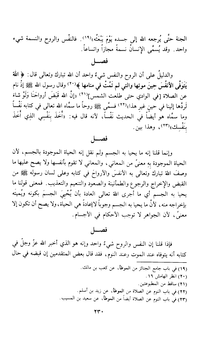 والدليل على أن الروح والنفس شيء واحد أن الله تبارك وتعالى قال: {اللَّهُ يَتَوَفَّى الأَنْفُسَ حِينَ مَوْتِهَا وَالَّتِي لَمْ تَمُتْ فِي مَنَامِهَا} [الزمر: 42] وقال رسول الله - صَلَّى اللَّهُ عَلَيْهِ وَسَلَّمَ -: إذ نام عن الصلاة [في الوادي حتى طلعت الشمس] «إن الله قبض أرواحنا ولو شاء لردها إلينا في حين غير هذا»، فسمى - صَلَّى اللَّهُ عَلَيْهِ وَسَلَّمَ - روحا ما سماه الله تعالى في كتابه نفسا وما سماه هو أيضا في الحديث نفسا؛ لأنه قال فيه: «أخذ بنفسي الذي أخذ بنفسك»، وهذا بين.