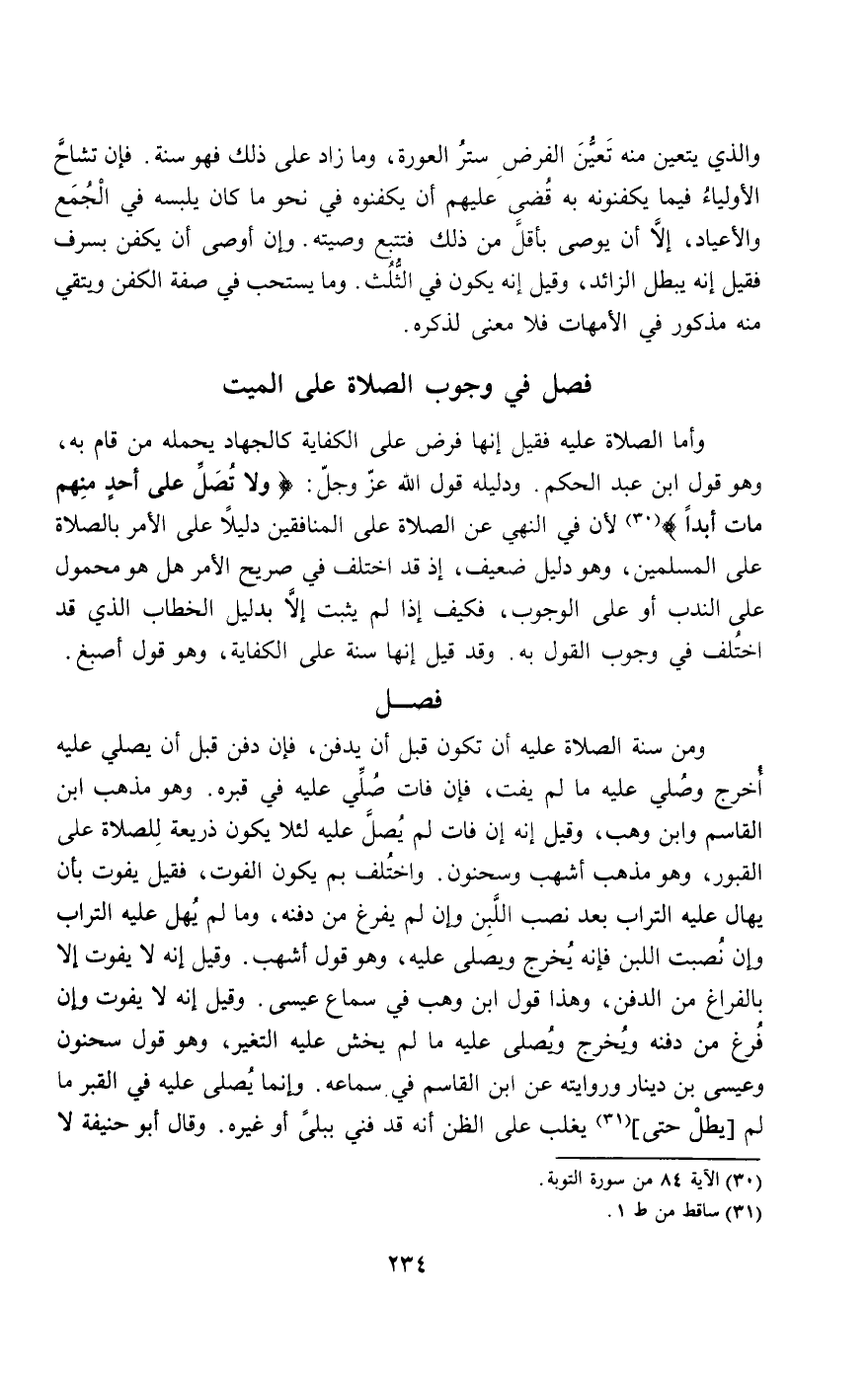 وأما الصلاة عليه فقيل: إنها فرض على الكفاية كالجهاد يحمله من قام به، وهو قول ابن عبد الحكم. ودليله قول الله عز وجل: {وَلا تُصَلِّ عَلَى أَحَدٍ مِنْهُمْ مَاتَ أَبَدًا} [التوبة: 84]؛ لأن في النهي عن الصلاة على المنافقين دليلا على الأمر بالصلاة على المسلمين، وهو دليل ضعيف، إذ قد اختلف في صريح الأمر هل هو محمول على الندب أو على الوجوب، فكيف إذا لم يثبت إلا بدليل الخطاب الذي قد اختلف في وجوب القول به. وقد قيل: إنها سنة على الكفاية، وهو قول أصبغ.