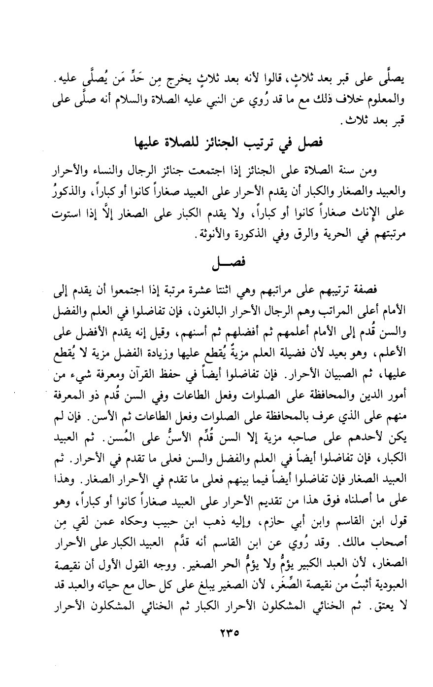 ومن سنة الصلاة على الجنائز إذا اجتمعت جنائز الرجال والنساء والأحرار والعبيد والصغار والكبار، أن يقدم الأحرار على العبيد صغارا كانوا أو كبارا، والذكور على الإناث صغارا كانوا أو كبارا، ولا يقدم الكبار على الصغار إلا إذا استوت مرتبتهم في الحرية والرق، وفي الذكورة والأنوثة.