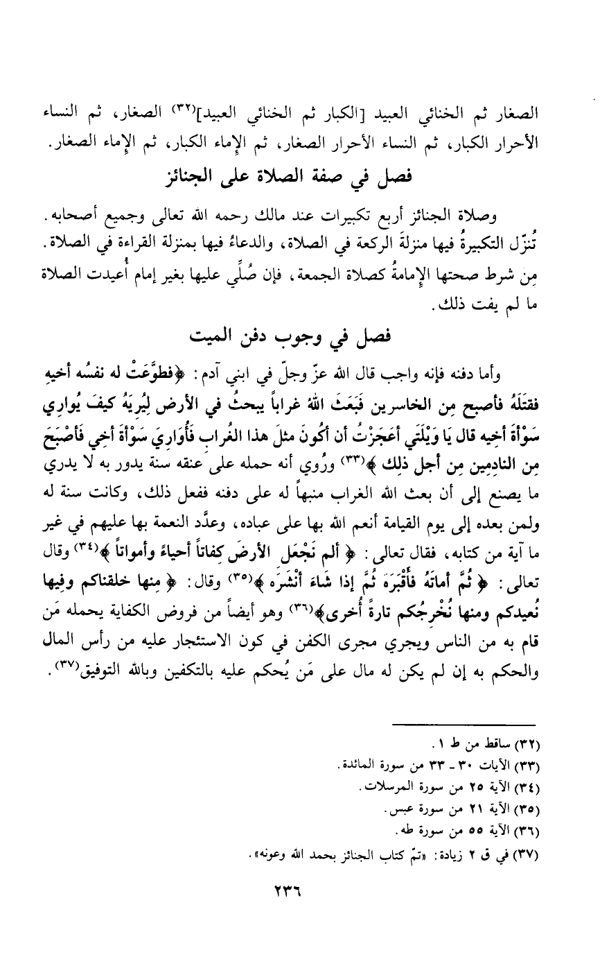 وأما دفنه فإنه واجب، قال الله عز وجل في ابني آدم: {فَطَوَّعَتْ لَهُ نَفْسُهُ قَتْلَ أَخِيهِ فَقَتَلَهُ فَأَصْبَحَ مِنَ الْخَاسِرِينَ - فَبَعَثَ اللَّهُ غُرَابًا يَبْحَثُ فِي الأَرْضِ لِيُرِيَهُ كَيْفَ يُوَارِي سَوْأَةَ أَخِيهِ قَالَ يَا وَيْلَتَا أَعَجَزْتُ أَنْ أَكُونَ مِثْلَ هَذَا الْغُرَابِ فَأُوَارِيَ سَوْأَةَ أَخِي فَأَصْبَحَ مِنَ النَّادِمِينَ} [المائدة: 30 - 31] {مِنْ أَجْلِ ذَلِكَ} [المائدة: 32]، وروي أنه حمله على عنقه سنة يدور به لا يدري ما يصنع إلى أن بعث الله الغراب منبها له على دفنه ففعل ذلك، وكانت سنة له ولمن بعده إلى يوم القيامة أنعم الله بها على عباده، وعدد النعمة بها عليهم في غير ما آية من كتابه، فقال تعالى: {أَلَمْ نَجْعَلِ الأَرْضَ كِفَاتًا} [المرسلات: 25] {أَحْيَاءً وَأَمْوَاتًا} [المرسلات: 26]، وقال تعالى: {ثُمَّ أَمَاتَهُ فَأَقْبَرَهُ} [عبس: 21] {ثُمَّ إِذَا شَاءَ أَنْشَرَهُ} [عبس: 22]، وقال: {مِنْهَا خَلَقْنَاكُمْ وَفِيهَا نُعِيدُكُمْ وَمِنْهَا نُخْرِجُكُمْ تَارَةً أُخْرَى} [طه: 55]، وهو أيضا من فروض الكفاية يحمله من قام به من الناس، ويجري مجرى الكفن في كون الاستئجار عليه من رأس المال، والحكم به إن لم يكن له مال على من يحكم عليه بالتكفين، وبالله التوفيق.
