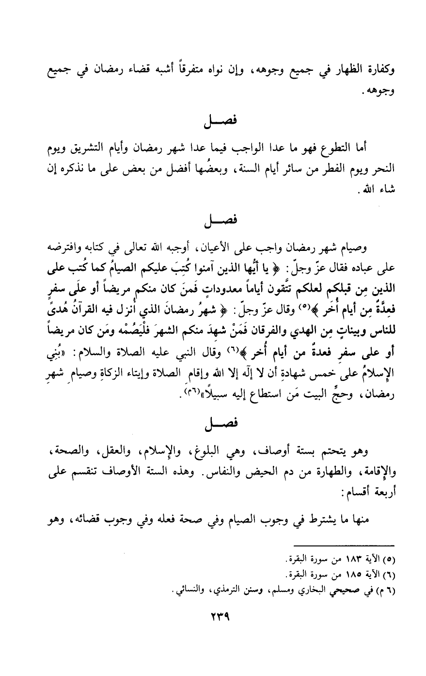 وهو يتحتم بستة أوصاف، وهي: البلوغ، والإسلام، والعقل، والصحة، والإقامة، والطهارة من دم الحيض والنفاس. وهذه الستة الأوصاف تنقسم على أربعة أقسام: