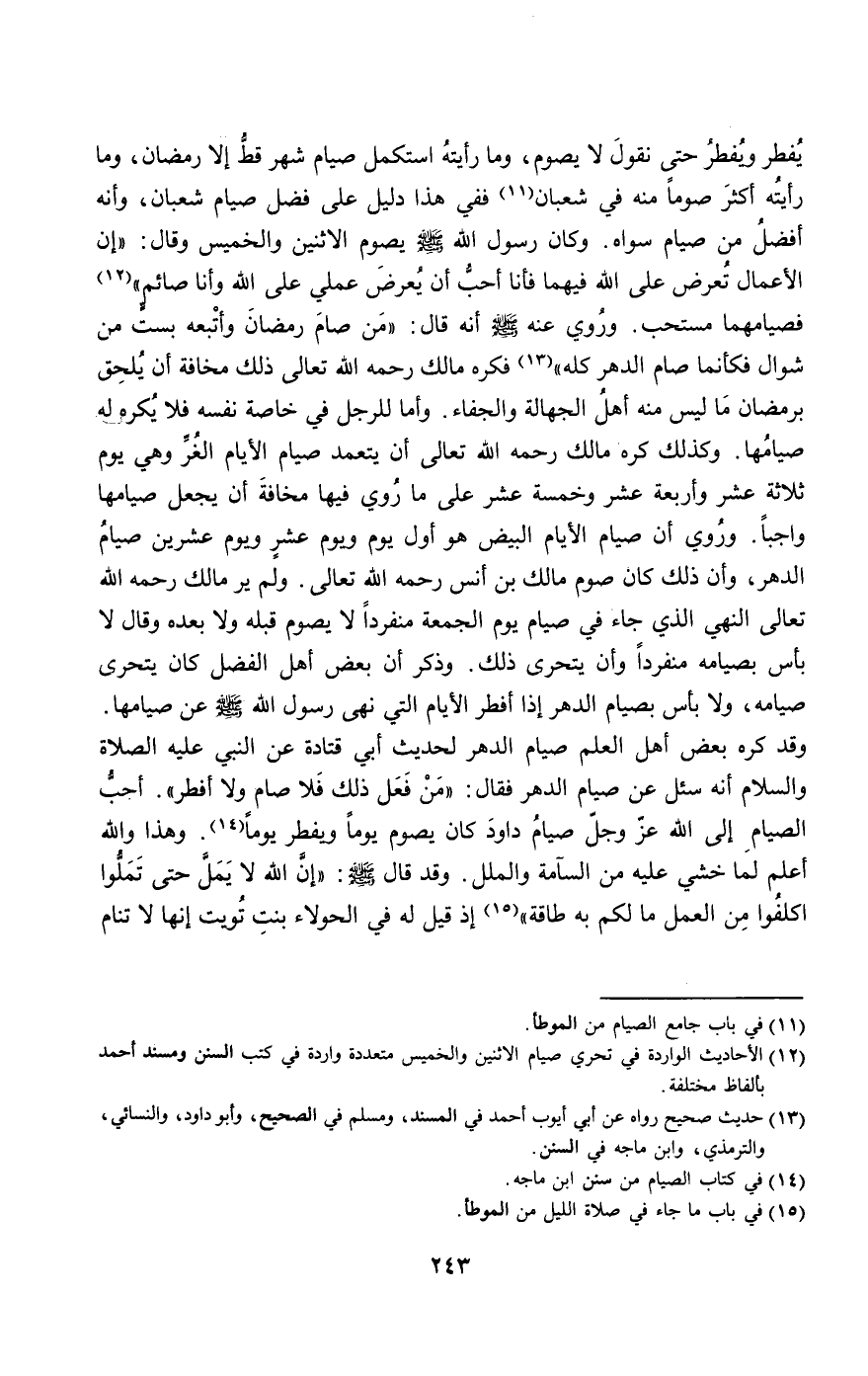 يفطر، ويفطر حتى نقول لا يصوم، وما رأيته استكمل صيام شهر قط إلا رمضان، وما رأيته أكثر صوما منه في شعبان». ففي هذا دليل على فضل صيام شعبان، وأنه أفضل من صيام سواه. «وكان رسول الله - صَلَّى اللَّهُ عَلَيْهِ وَسَلَّمَ - يصوم الاثنين والخميس، وقال: " إن الأعمال تعرض على الله فيهما، فأنا أحب أن يعرض عملي على الله وأنا صائم» فصيامهما مستحب. وروي عنه - صَلَّى اللَّهُ عَلَيْهِ وَسَلَّمَ - أنه قال: «من صام رمضان وأتبعه بست من شوال فكأنما صام الدهر كله»، فكره مالك - رَحِمَهُ اللَّهُ تَعَالَى - ذلك مخافة أن يلحق برمضان ما ليس منه أهل الجهالة والجفاء. وأما للرجل في خاصة نفسه فلا يكره له صيامها. وكذلك كره مالك - رَحِمَهُ اللَّهُ تَعَالَى - أن يتعمد صيام الأيام الغر، وهي يوم ثلاثة عشر وأربعة عشر وخمسة عشر على ما روي فيها، مخافة أن يجعل صيامها واجبا. وروي أن صيام الأيام البيض هو أول يوم ويوم عشر ويوم عشرين صيام الدهر، وأن ذلك كان صوم مالك بن أنس - رَحِمَهُ اللَّهُ تَعَالَى -. ولم ير مالك - رَحِمَهُ اللَّهُ تَعَالَى - النهي الذي جاء في صيام يوم الجمعة منفردا لا يصوم قبله ولا بعده، وقال: لا بأس بصيامه منفردا وأن يتحرى ذلك. وذكر أن بعض أهل الفضل كان يتحرى صيامه، ولا بأس بصيام الدهر إذا أفطر الأيام التي نهى رسول الله - صَلَّى اللَّهُ عَلَيْهِ وَسَلَّمَ - عن صيامها. وقد كره بعض أهل العلم صيام الدهر؛ لحديث أبي قتادة عن «النبي - عَلَيْهِ الصَّلَاةُ وَالسَّلَامُ - أنه سئل عن صيام الدهر، فقال: من فعل ذلك فلا صام ولا أفطر، أحب الصيام إلى الله عز وجل صيام داود كان يصوم يوما ويفطر يوما» وهذا والله أعلم لما خشي عليه من السآمة والملل. وقد قال - صَلَّى اللَّهُ عَلَيْهِ وَسَلَّمَ -: «إن الله لا يمل حتى تملوا اكلفوا من العمل ما لكم به طاقة» إذ قيل له في الحولاء بنت تويت: إنها لا تنام