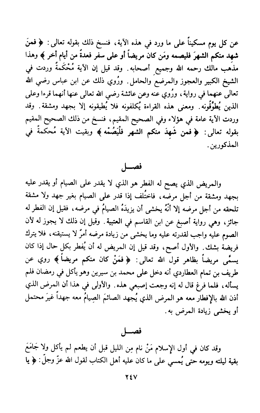عن كل يوم مسكينا على ما ورد في هذه الآية، فنسخ ذلك بقوله تعالى: {فَمَنْ شَهِدَ مِنْكُمُ الشَّهْرَ فَلْيَصُمْهُ وَمَنْ كَانَ مَرِيضًا أَوْ عَلَى سَفَرٍ فَعِدَّةٌ مِنْ أَيَّامٍ أُخَرَ} [البقرة: 185]، وهذا مذهب مالك - رَحِمَهُ اللَّهُ - وجميع أصحابه. وقد قيل: إن الآية محكمة وردت في الشيخ الكبير والعجوز والمرضع والحامل. وروي ذلك عن ابن عباس - رَضِيَ اللَّهُ تَعَالَى عَنْهُمَا - في رواية، وروي عنه وعن عائشة - رَضِيَ اللَّهُ تَعَالَى عَنْهَا - أنهما قرءا وعلى الذين يطوقونه. ومعنى هذه القراءة يكلفونه فلا يطيقونه إلا بجهد ومشقة. وقد وردت الآية عامة في هؤلاء وفي الصحيح المقيم، فنسخ من ذلك الصحيح المقيم بقوله تعالى: {فَمَنْ شَهِدَ مِنْكُمُ الشَّهْرَ فَلْيَصُمْهُ} [البقرة: 185] وبقيت الآية محكمة في المذكورين.