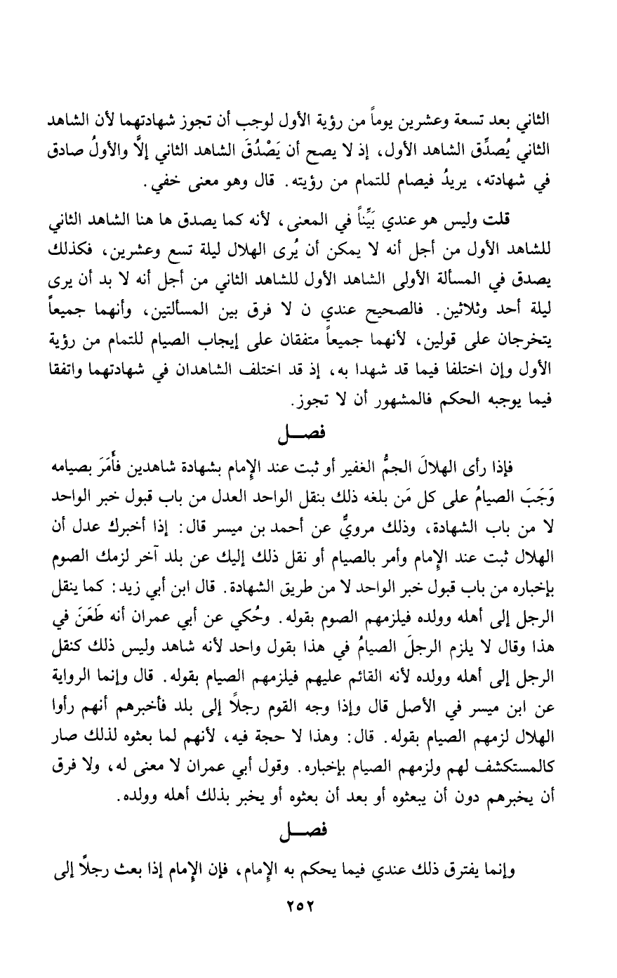 فإذا رأى الهلال الجم الغفير أو ثبت عند الإمام بشهادة شاهدين فأمر بصيامه وجب الصيام على كل من بلغه ذلك بنقل الواحد العدل من باب قبول خبر الواحد لا من باب الشهادة، وذلك مروي عن أحمد بن ميسر قال: إذا أخبرك عدل أن الهلال ثبت عند الإمام وأمر بالصيام أو نقل ذلك إليك عن بلد آخر لزمك الصوم بإخباره من باب قبول خبر الواحد لا من طريق الشهادة. قال ابن أبي زيد: كما ينقل الرجل إلى أهله وولده فيلزمهم الصوم بقوله. وحكي عن أبي عمران أنه طعن في هذا وقال: لا يلزم الرجل الصيام في هذا بقول واحد؛ لأنه شاهد وليس ذلك كنقل الرجل إلى أهله وولده؛ لأنه القائم عليهم فيلزمهم الصيام بقوله. قال: وإنما الرواية عن ابن ميسر في الأصل قال: وإذا وجه القوم رجلا إلى بلد فأخبرهم أنهم رأوا الهلال لزمهم الصيام بقوله. قال: وهذا لا حجة فيه؛ لأنهم لما بعثوه لذلك صار كالمستكشف لهم ولزمهم الصيام بإخباره. وقول أبي عمران لا معنى له، ولا فرق أن يخبرهم دون أن يبعثوه أو بعد أن بعثوه أو يخبر بذلك أهله وولده.