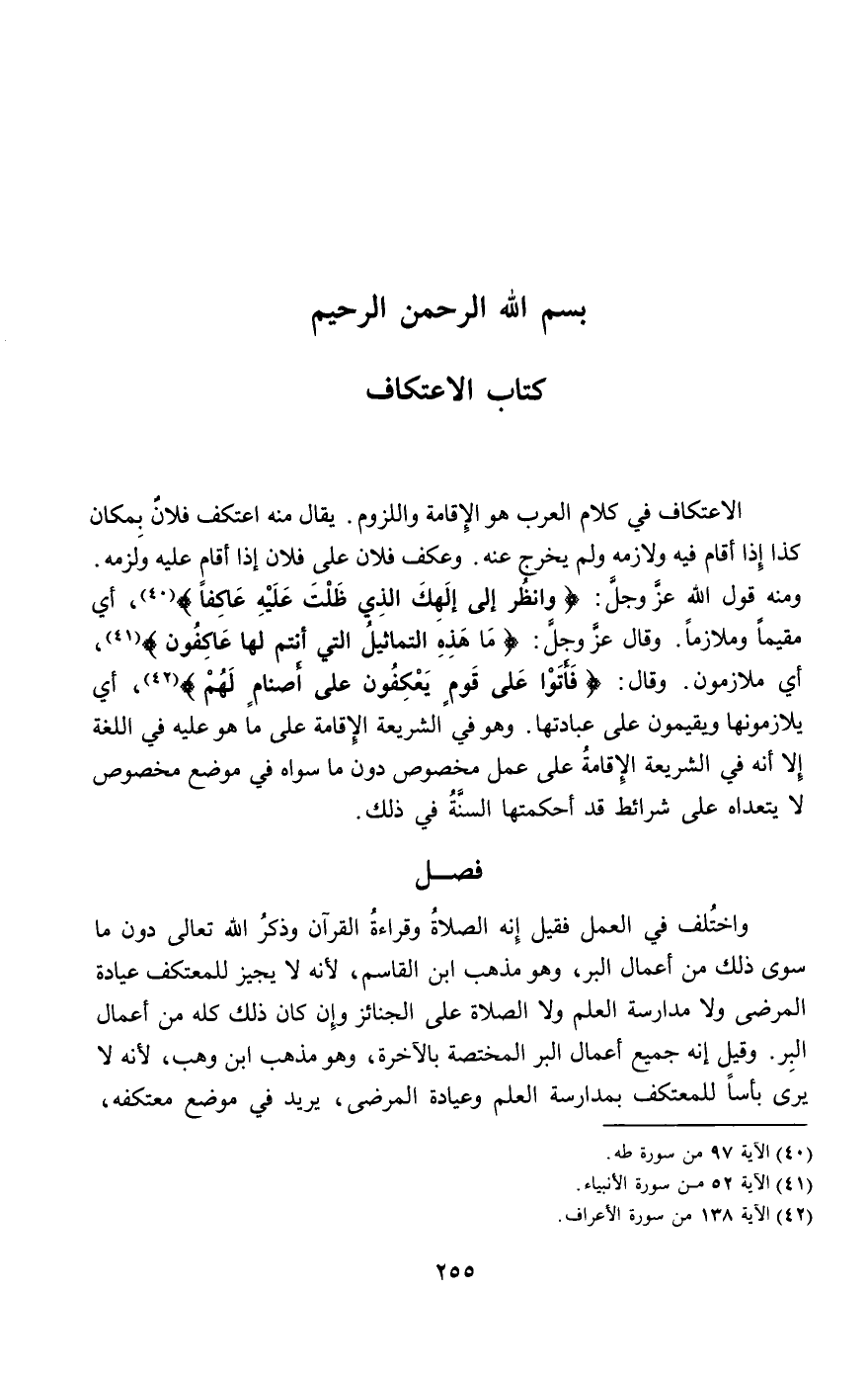 الاعتكاف في كلام العرب هو الإقامة واللزوم. يقال منه اعتكف فلان بمكان كذا إذا أقام فيه ولازمه ولم يخرج عنه. وعكف فلان على فلان إذا أقام عليه ولزمه، ومنه قول الله عز وجل: {وَانْظُرْ إِلَى إِلَهِكَ الَّذِي ظَلْتَ عَلَيْهِ عَاكِفًا} [طه: 97]، أي: مقيما وملازما، وقال عز وجل: {مَا هَذِهِ التَّمَاثِيلُ الَّتِي أَنْتُمْ لَهَا عَاكِفُونَ} [الأنبياء: 52]، أي: ملازمون، وقال: {فَأَتَوْا عَلَى قَوْمٍ يَعْكُفُونَ عَلَى أَصْنَامٍ لَهُمْ} [الأعراف: 138]، أي: يلازمونها ويقيمون على عبادتها. وهو في الشريعة الإقامة على ما هو عليه في اللغة إلا أنه في الشريعة الإقامة على عمل مخصوص دون ما سواه، في موضع مخصوص لا يتعداه، على شرائط قد أحكمتها السنة في ذلك.