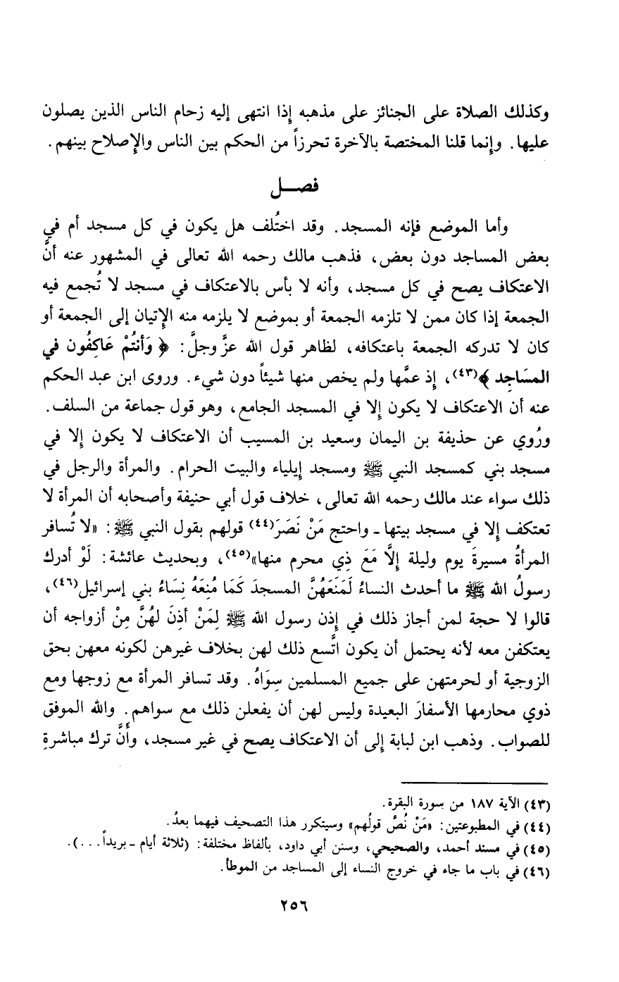 وأما الموضع فإنه المسجد. وقد اختلف هل يكون في كل مسجد أم في بعض المساجد دون بعض، فذهب مالك - رَحِمَهُ اللَّهُ تَعَالَى - في المشهور عنه أن الاعتكاف يصح في كل مسجد، وأنه لا بأس بالاعتكاف في مسجد لا تجمع فيه الجمعة، إذا كان ممن لا تلزمه الجمعة، أو بموضع لا يلزمه منه الإتيان إلى الجمعة، أو كان لا تدركه الجمعة باعتكافه؛ لظاهر قول الله عز وجل: {وَأَنْتُمْ عَاكِفُونَ فِي الْمَسَاجِدِ} [البقرة: 187]، إذ عمها ولم يخص منها شيئا دون شيء. وروى ابن عبد الحكم عنه أن الاعتكاف لا يكون إلا في المسجد الجامع، وهو قول جماعة من السلف. وروي عن حذيفة بن اليمان وسعيد بن المسيب أن الاعتكاف لا يكون إلا في مسجد بني كمسجد النبي - صَلَّى اللَّهُ عَلَيْهِ وَسَلَّمَ - ومسجد إيلياء والبيت الحرام. والمرأة والرجل في ذلك سواء عند مالك - رَحِمَهُ اللَّهُ تَعَالَى -، خلاف قول أبي حنيفة وأصحابه أن المرأة لا تعتكف إلا في مسجد بيتها - واحتج من نصر قولهم بقول النبي - صَلَّى اللَّهُ عَلَيْهِ وَسَلَّمَ -: «لا تسافر المرأة مسيرة يوم وليلة إلا مع ذي محرم منها»، وبحديث عائشة: «لو أدرك رسول الله - صَلَّى اللَّهُ عَلَيْهِ وَسَلَّمَ - ما أحدث النساء لمنعهن المسجد كما منعه نساء بني إسرائيل» قالوا: لا حجة لمن أجاز ذلك في إذن رسول الله - صَلَّى اللَّهُ عَلَيْهِ وَسَلَّمَ - لمن أذن لهن من أزواجه أن يعتكفن معه؛ لأنه يحتمل أن يكون اتسع ذلك لهن بخلاف غيرهن، لكونه معهن بحق الزوجية أو لحرمتهن على جميع المسلمين سواه. وقد تسافر المرأة مع زوجها ومع ذوي محارمها الأسفار البعيدة وليس لهن أن يفعلن ذلك مع سواهم. والله الموفق للصواب. وذهب ابن لبابة إلى أن الاعتكاف يصح في غير مسجد، وأن ترك مباشرة