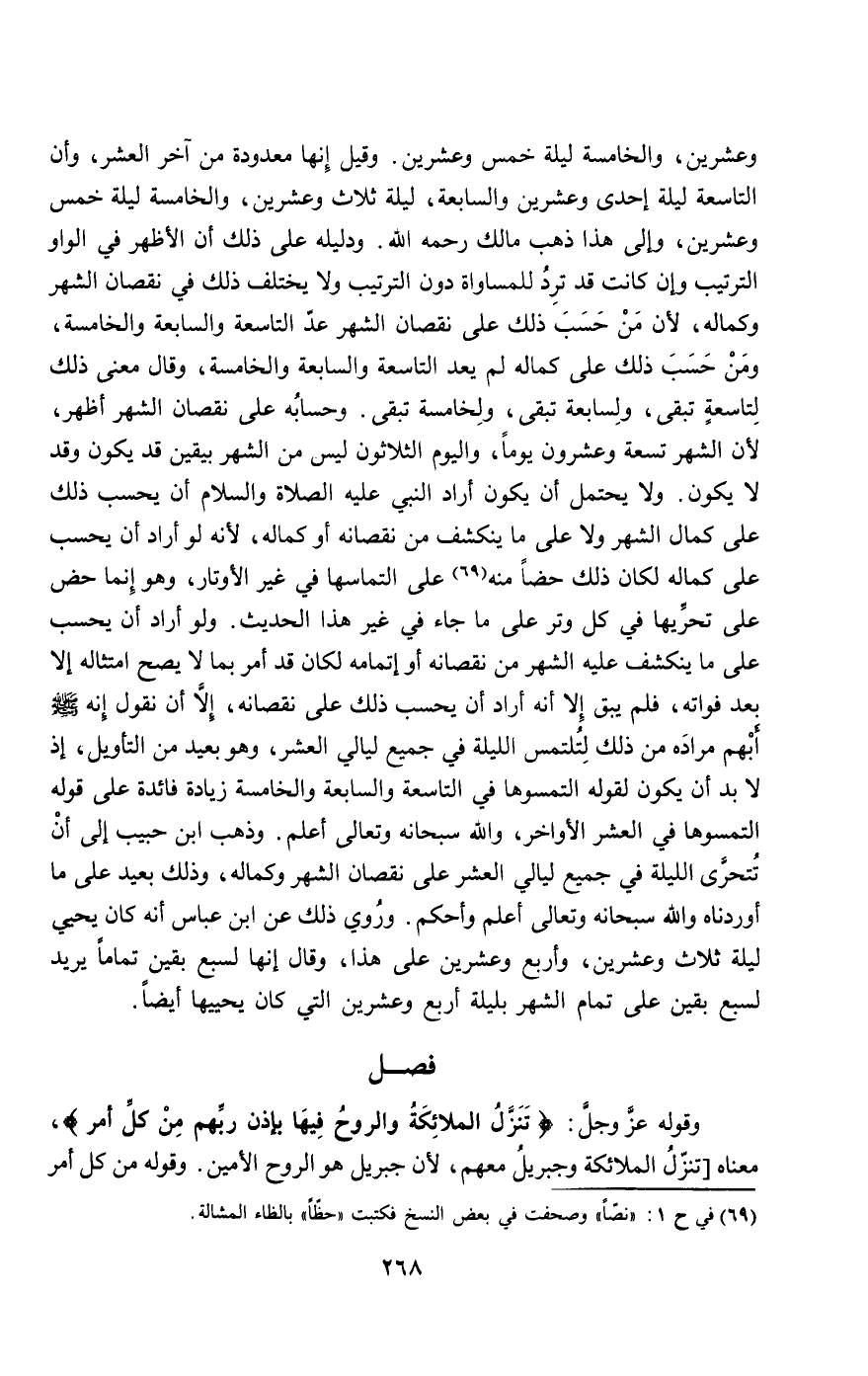 وعشرين، والخامسة ليلة خمس وعشرين. وقيل إنها معدودة من آخر العشر، وأن التاسعة ليلة إحدى وعشرين والسابعة، ليلة ثلاث وعشرين، والخامسة ليلة خمس وعشرين، وإلى هذا ذهب مالك - رَحِمَهُ اللَّهُ -. ودليله على ذلك أن الأظهر في الواو الترتيب وإن كانت قد ترد للمساواة دون الترتيب ولا يختلف ذلك في نقصان الشهر وكماله، لأن من حسب ذلك على نقصان الشهر عد التاسعة والسابعة والخامسة، ومن حسب ذلك على كماله لم يعد التاسعة والسابعة والخامسة، وقال معنى ذلك لتاسعة تبقى، ولسابعة تبقى، ولخامسة تبقى. وحسابه على نقصان الشهر أظهر، لأن الشهر تسعة وعشرون يوما، واليوم الثلاثون ليس من الشهر بيقين قد يكون وقد لا يكون. ولا يحتمل أن يكون أراد النبي - عَلَيْهِ الصَّلَاةُ وَالسَّلَامُ - أن يحسب ذلك على كمال الشهر ولا على ما ينكشف من نقصانه أو كماله، لأنه لو أراد أن يحسب على كماله لكان ذلك حضا منه على التماسها في غير الأوتار، وهو إنما حض على تحريها في كل وتر على ما جاء في غير هذا الحديث. ولو أراد أن يحسب على ما ينكشف عليه الشهر من نقصانه أو إتمامه لكان قد أمر بما لا يصح امتثاله إلا بعد فواته، فلم يبق إلا أنه أراد أن يحسب ذلك على نقصانه، إلا أن نقول إنه - صَلَّى اللَّهُ عَلَيْهِ وَسَلَّمَ - أبهم مراده من ذلك لتلتمس الليلة في جميع ليالي العشر، وهو بعيد من التأويل، إذ لا بد أن يكون لقوله التمسوها في التاسعة والسابعة والخامسة زيادة فائدة على قوله: «التمسوها في العشر الأواخر،» والله سبحانه وتعالى أعلم. وذهب ابن حبيب إلى أن تتحرى الليلة في جميع ليالي العشر على نقصان الشهر وكماله، وذلك بعيد على ما أوردناه والله سبحانه وتعالى أعلم وأحكم. وروي ذلك عن ابن عباس أنه كان يحيي ليلة ثلاث وعشرين، وأربع وعشرين على هذا، وقال إنها لسبع بقين تماما يريد لسبع بقين على تمام الشهر بليلة أربع وعشرين التي كان يحييها أيضا.