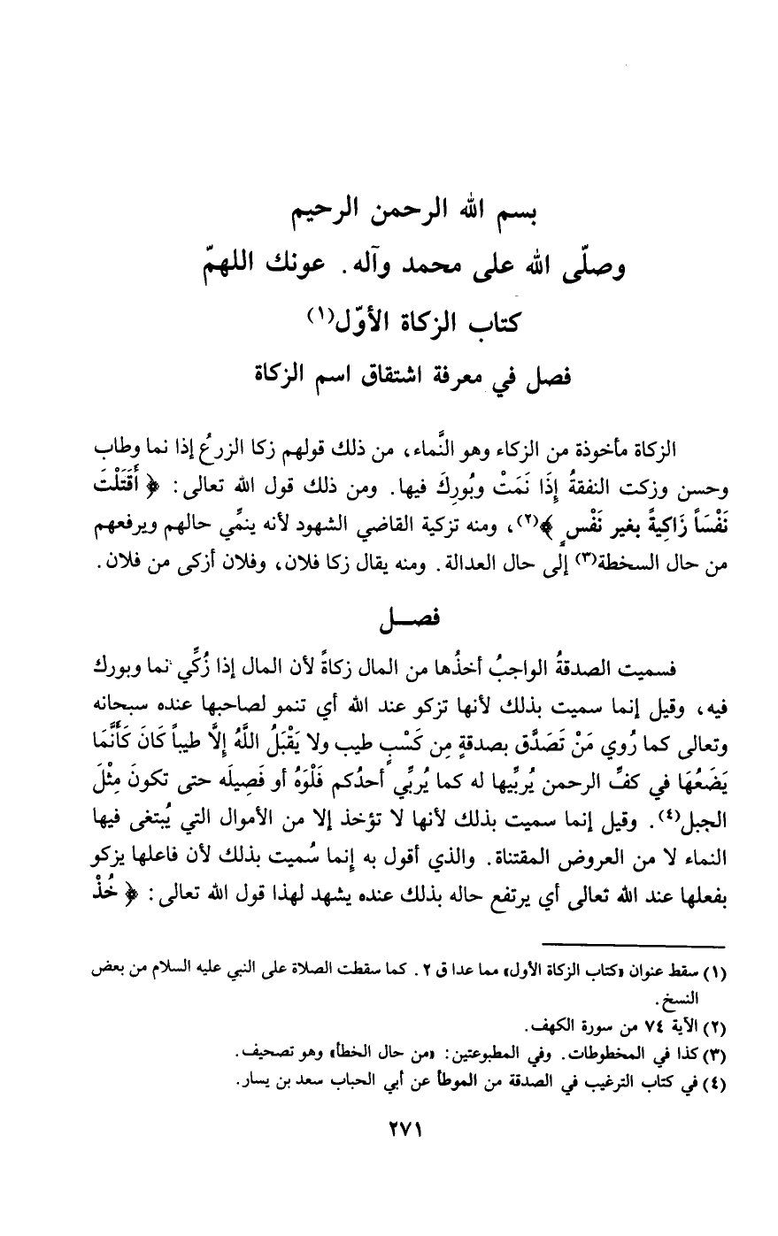 الزكاة مأخوذة من الزكاء وهو النماء، من ذلك قولهم زكا الزرع إذا نما وطاب وحسن وزكت النفقة إذا نمت وبورك فيها. ومن ذلك قول الله تعالى: (أقتلت نفسا زاكية بغير نفس)، ومنه تزكية القاضي الشهود لأنه ينمي حالهم ويرفعهم من حال السخطة إلى حال العدالة. ومنه يقال زكا فلان، وفلان أزكى من فلان.