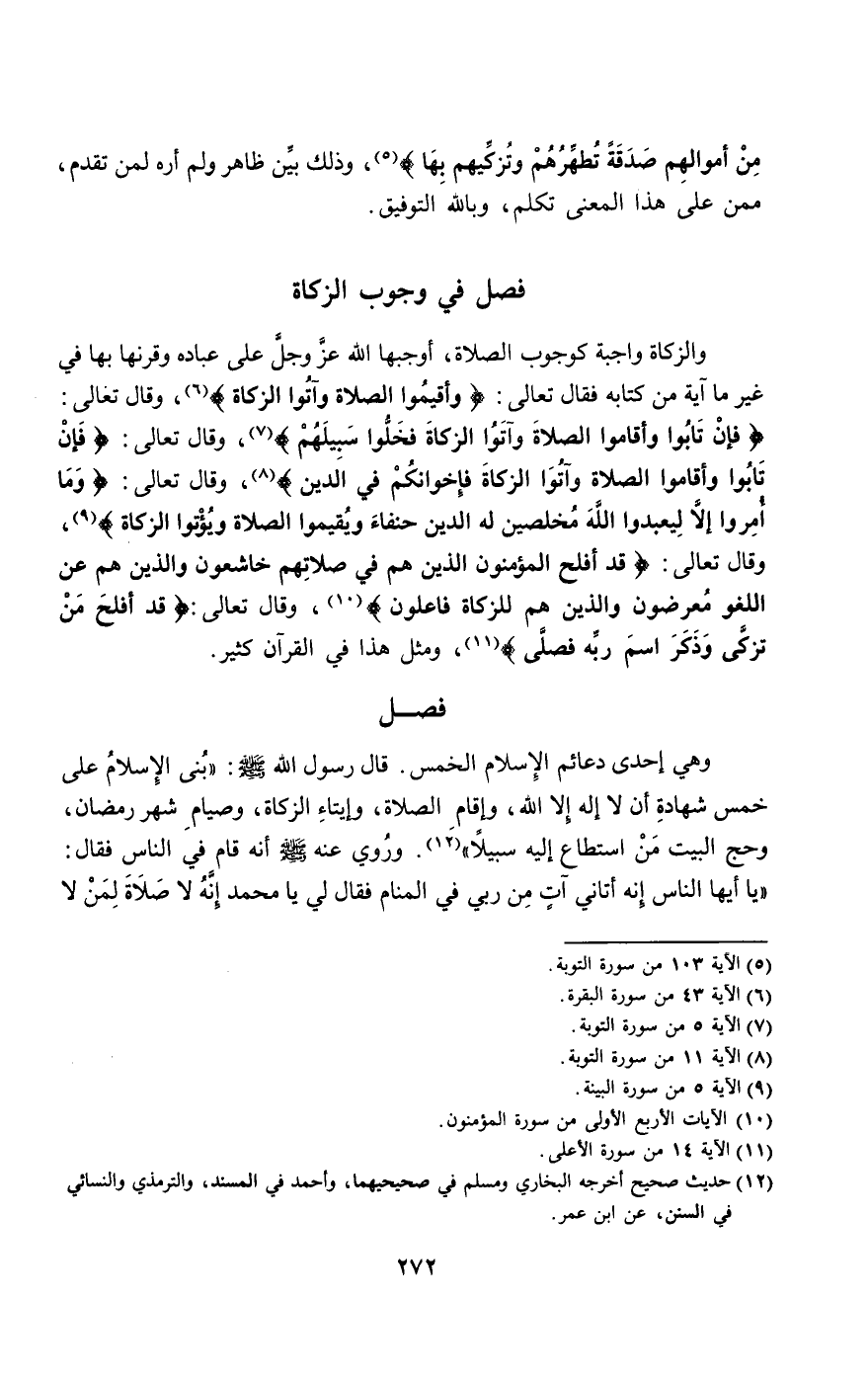 والزكاة واجبة كوجوب الصلاة، أوجبها الله عز وجل على عباده وقرنها بها في غير ما آية من كتابه فقال تعالى: {وَأَقِيمُوا الصَّلاةَ وَآتُوا الزَّكَاةَ} [البقرة: 43]، وقال تعالى: {فَإِنْ تَابُوا وَأَقَامُوا الصَّلاةَ وَآتَوُا الزَّكَاةَ فَخَلُّوا سَبِيلَهُمْ} [التوبة: 5]، وقال تعالى: {فَإِنْ تَابُوا وَأَقَامُوا الصَّلاةَ وَآتَوُا الزَّكَاةَ فَإِخْوَانُكُمْ فِي الدِّينِ} [التوبة: 11]، وقال تعالى: {وَمَا أُمِرُوا إِلا لِيَعْبُدُوا اللَّهَ مُخْلِصِينَ لَهُ الدِّينَ حُنَفَاءَ وَيُقِيمُوا الصَّلاةَ وَيُؤْتُوا الزَّكَاةَ} [البينة: 5]، وقال تعالى: {قَدْ أَفْلَحَ الْمُؤْمِنُونَ} [المؤمنون: 1] {الَّذِينَ هُمْ فِي صَلاتِهِمْ خَاشِعُونَ} [المؤمنون: 2] {وَالَّذِينَ هُمْ عَنِ اللَّغْوِ مُعْرِضُونَ} [المؤمنون: 3] {وَالَّذِينَ هُمْ لِلزَّكَاةِ فَاعِلُونَ} [المؤمنون: 4]، وقال تعالى: {قَدْ أَفْلَحَ مَنْ تَزَكَّى} [الأعلى: 14] {وَذَكَرَ اسْمَ رَبِّهِ فَصَلَّى} [الأعلى: 15]، ومثل هذا في القرآن كثير.