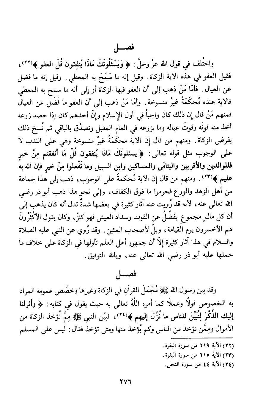 واختلف في قول الله عز وجل: {وَيَسْأَلُونَكَ مَاذَا يُنْفِقُونَ قُلِ الْعَفْوَ} [البقرة: 219]، فقيل العفو في هذه الآية الزكاة. وقيل إنه ما سمح به المعطي. وقيل إنه ما فضل عن العيال. فأما من ذهب إلى أن العفو فيها الزكاة أو إلى أنه ما سمح به المعطي فالآية عنده محكمة غير منسوخة. وأما من ذهب إلى أن العفو ما فضل عن العيال فمنهم من قال إن ذلك كان واجبا في أول الإسلام وإن أحدهم كان إذا حصد زرعه أخذ منه قوته وقوت عياله وما يزرعه في العام المقبل وتصدق بالباقي ثم نسخ ذلك بفرض الزكاة. ومنهم من قال إن الآية محكمة غير منسوخة وهي على الندب لا على الوجوب مثل قَوْله تَعَالَى: {يَسْأَلُونَكَ مَاذَا يُنْفِقُونَ قُلْ مَا أَنْفَقْتُمْ مِنْ خَيْرٍ فَلِلْوَالِدَيْنِ وَالأَقْرَبِينَ وَالْيَتَامَى وَالْمَسَاكِينِ وَابْنِ السَّبِيلِ وَمَا تَفْعَلُوا مِنْ خَيْرٍ فَإِنَّ اللَّهَ بِهِ عَلِيمٌ} [البقرة: 215]. ومنهم من قال إن الآية محكمة على الوجوب، ذهب إلى هذا جماعة من أهل الزهد والورع فحرموا ما فوق الكفاف، وإلى نحو هذا ذهب أبو ذر - رَضِيَ اللَّهُ تَعَالَى عَنْهُ -، لأنه قد رويت عنه آثار كثيرة في بعضها شدة تدل أنه كان يذهب إلى أن كل مال مجموع يفضل عن القوت وسداد العيش فهو كنز، وكان يقول الأكثرون هم الأخسرون يوم القيامة، ويل لأصحاب المئين. وقد روي عن النبي - عَلَيْهِ الصَّلَاةُ وَالسَّلَامُ - في هذا آثار كثيرة إلا أن جمهور أهل العلم تأولها في الزكاة على خلاف ما حملها عليه أبو ذر - رَضِيَ اللَّهُ تَعَالَى عَنْهُ -، وبالله التوفيق.