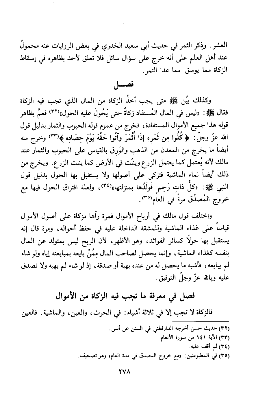 وكذلك بين - صَلَّى اللَّهُ عَلَيْهِ وَسَلَّمَ - متى يجب أخذ الزكاة من المال الذي تجب فيه الزكاة فقال - صَلَّى اللَّهُ عَلَيْهِ وَسَلَّمَ -: «ليس في المال المستفاد زكاة حتى يحول عليه الحول» فعم بظاهر قوله هذا جميع الأموال المستفادة، فخرج من عموم قوله الحبوب والثمار بدليل قول الله عز وجل: {كُلُوا مِنْ ثَمَرِهِ إِذَا أَثْمَرَ وَآتُوا حَقَّهُ يَوْمَ حَصَادِهِ} [الأنعام: 141] وخرج منه أيضا ما يخرج من المعدن من الذهب والورق بالقياس على الحبوب والثمار عند مالك لأنه يعتمل كما يعتمل الزرع وينبت في الأرض كما ينبت الزرع. ويخرج من ذلك أيضا نماء الماشية فتزكى على أصولها ولا يستقبل بها الحول بدليل قول النبي - صَلَّى اللَّهُ عَلَيْهِ وَسَلَّمَ -: «كل ذات رحم فولدها بمنزلتها»، ولعلة افتراق الحول فيها مع خروج المصدق مرة في العام.