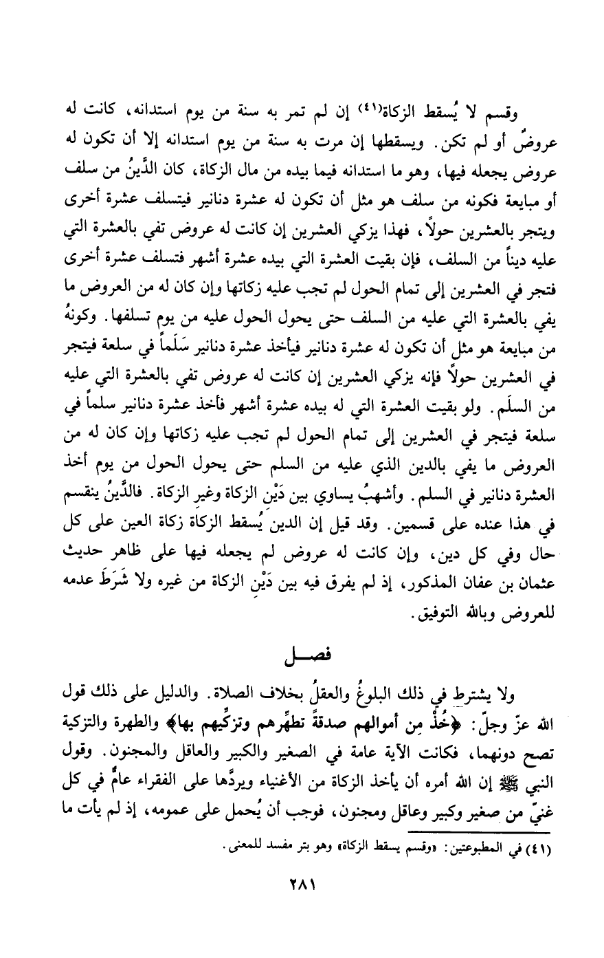 ولا يشترط في ذلك البلوغ والعقل بخلاف الصلاة. والدليل على ذلك قول الله عز وجل: {خُذْ مِنْ أَمْوَالِهِمْ صَدَقَةً تُطَهِّرُهُمْ وَتُزَكِّيهِمْ بِهَا} [التوبة: 103] والطهرة والتزكية تصح دونهما، فكانت الآية عامة في الصغير والكبير والعاقل والمجنون. وقول النبي - صَلَّى اللَّهُ عَلَيْهِ وَسَلَّمَ - «إن الله أمره أن يأخذ الزكاة من الأغنياء ويردها على الفقراء» عام في كل غني من صغير وكبير وعاقل ومجنون، فوجب أن يحمل على عمومه، إذ لم يأت ما