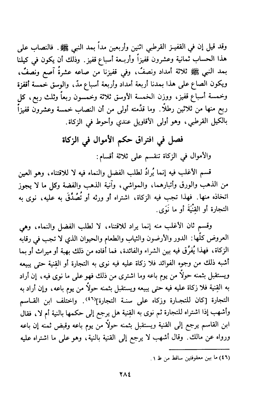وقسم ثان الأغلب منه إنما يراد للاقتناء، لا لطلب الفضل والنماء، وهي العروض كلها: الدور والأرضون والثياب والطعام والحيوان الذي لا تجب في رقابه الزكاة، فهذا يفرق فيه بين الشراء والفائدة، فما أفاده من ذلك بهبة أو ميراث أو بما أشبه ذلك من وجوه الفوائد فلا زكاة عليه فيه نوى به التجارة أو القنية حتى يبيعه ويستقبل بثمنه حولا من يوم باعه وما اشترى من ذلك فهو على ما نوى فيه، إن أراد به القنية فلا زكاة عليه فيه حتى يبيعه ويستقبل بثمنه حولا من يوم باعه، وإن أراد به التجارة أكان للتجارة وزكاه على سنة التجارة،. واختلف ابن القاسم وأشهب إذا اشتراه للتجارة ثم نوى به القنية هل يرجع إلى حكمها بالنية أم لا، فقال ابن القاسم يرجع إلى القنية ويستقبل بثمنه حولا من يوم باعه وقبض ثمنه إن باعه ورواه عن مالك. وقال أشهب لا يرجع إلى القنية بالنية، وهو على ما اشتراه عليه