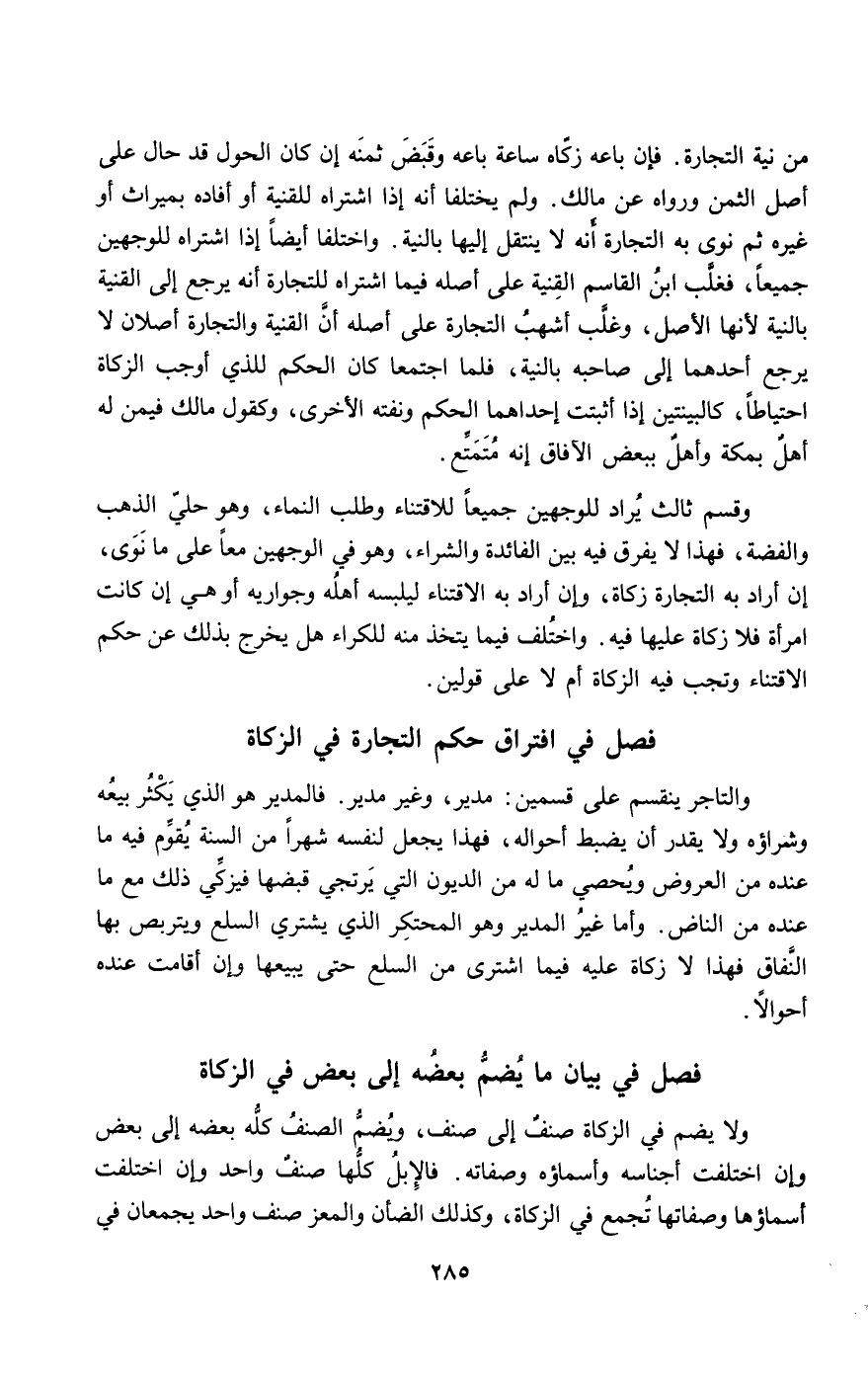 والتاجر ينقسم على قسمين: مدير، وغير مدير. فالمدير هو الذي يكثر بيعه وشراؤه ولا يقدر أن يضبط أحواله، فهذا يجعل لنفسه شهرا من السنة يقوم فيه ما عنده من العروض ويحصي ما له من الديون التي يرتجى قبضها فيزكي ذلك مع ما عنده من الناض. وأما غير المدير وهو المحتكر الذي يشتري السلع ويتربص بها النفاق فهذا لا زكاة عليه فيما اشترى من السلع حتى يبيعها وإن أقامت عنده أحوالا.