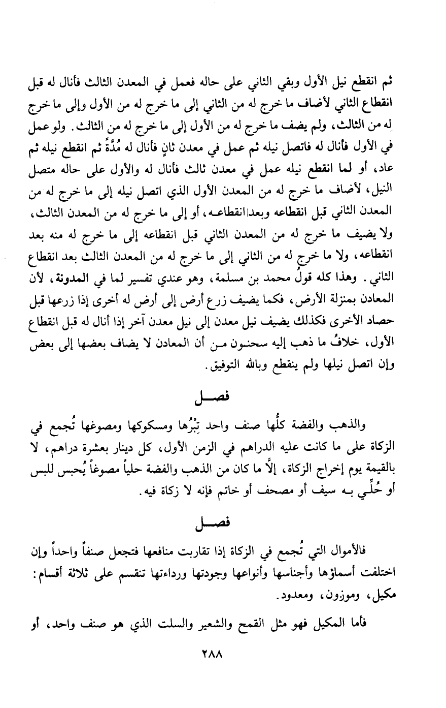 ثم انقطع نيل الأول وبقي الثاني على حاله فعمل في المعدن الثالث فأنال له قبل انقطاع الثاني لأضاف ما خرج له من الثاني إلى ما خرج له من الأول وإلى ما خرج له من الثالث، ولم يضف ما خرج له من الأول إلى ما خرج له من الثالث. ولو عمل في الأول فأنال له فاتصل نيله ثم عمل في معدن ثان فأنال له مدة ثم انقطع نيله ثم عاد، أو لما انقطع نيله عمل في معدن ثالث فأنال له والأول على حاله متصل النيل، لأضاف ما خرج له من المعدن الأول الذي اتصل نيله إلى ما خرج له من المعدن الثاني قبل انقطاعه وبعدا انقطاعه، أو إلى ما خرج له من المعدن الثالث، ولا يضيف ما خرج له من المعدن الثاني قبل انقطاعه إلى ما خرج له منه بعد انقطاعه، ولا ما خرج له من الثاني إلى ما خرج له من المعدن الثالث بعد انقطاع الثاني. وهذا كله قول محمد بن مسلمة، وهو عندي تفسير لما في المدونة، لأن المعادن بمنزلة الأرض، فكما يضيف زرع أرض إلى أرض له أخرى إذا زرعها قبل حصاد الأخرى فكذلك يضيف نيل معدن إلى نيل معدن آخر إذا أنال له قبل انقطاع الأول، خلاف ما ذهب إليه سحنون من أن المعادن لا يضاف بعضها إلى بعض وإن اتصل نيلها ولم ينقطع وبالله التوفيق.
