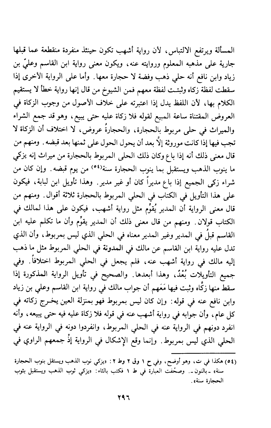 المسألة ويرتفع الالتباس، لأن رواية أشهب تكون حينئذ منفردة منقطعة عما قبلها جارية على مذهبه المعلوم وروايته عنه، ويكون معنى رواية ابن القاسم وعلي بن زياد وابن نافع أنه حلي ذهب وفضة لا حجارة معها. وأما على الرواية الأخرى إذا سقطت لفظة زكاه وثبتت لفظة معهم فمن الشيوخ من قال إنها رواية خطأ لا يستقيم الكلام بها، لأن اللفظ يدل إذا اعتبرته على خلاف الأصول من وجوب الزكاة في العروض المقتناة ساعة المبيع لقوله فلا زكاة عليه حتى يبيع، وهو قد جمع الشراء والميراث في حلى مربوط بالحجارة، والحجارة عروض، لا اختلاف أن الزكاة لا تجب فيها إذا كانت موروثة إلا بعد أن يحول الحول على ثمنها بعد قبضه. ومنهم من قال معنى ذلك أنه إذا باع وكان ذلك الحلي المربوط بالحجارة من ميراث إنه يزكي ما ينوب الذهب ويستقبل بما ينوب الحجارة سنة من يوم قبضه. وإن كان من شراء زكى الجميع إذا باع مديرا كان أو غير مدير. وهذا تأويل ابن لبابة، فيكون على هذا التأويل في الكتاب في الحلي المربوط بالحجارة ثلاثة أقوال. ومنهم من قال معنى الرواية أن المدير يقوم مثل رواية أشهب، فيكون على هذا لمالك في الكتاب قولان. ومنهم من قال معنى ذلك أن المدير يقوم وأن ما تكلم عليه ابن القاسم قبل في المدير وغير المدير معناه في الحلي الذي ليس بمربوط، وأن الذي تدل عليه رواية ابن القاسم عن مالك في المدونة في الحلي المربوط مثل ما ذهب إليه مالك في رواية أشهب عنه، فلم يجعل في الحلي المربوط اختلافا. وفي جميع التأويلات بعد، وهذا أبعدها. والصحيح في تأويل الرواية المذكورة إذا سقط منها زكاه وثبت فيها معهم أن جواب مالك في رواية ابن القاسم وعلي بن زياد وابن نافع عنه في قوله: وإن كان ليس بمربوط فهو بمنزلة العين يخرج زكاته في كل عام، وأن جوابه في رواية أشهب عنه في قوله فلا زكاة عليه فيه حتى يبيعه، وأنه انفرد دونهم في الرواية عنه في الحلي المربوط، وانفردوا دونه في الرواية عنه في الحلي الذي ليس بمربوط. وإنما وقع الإشكال في الرواية إذ جمعهم الراوي في