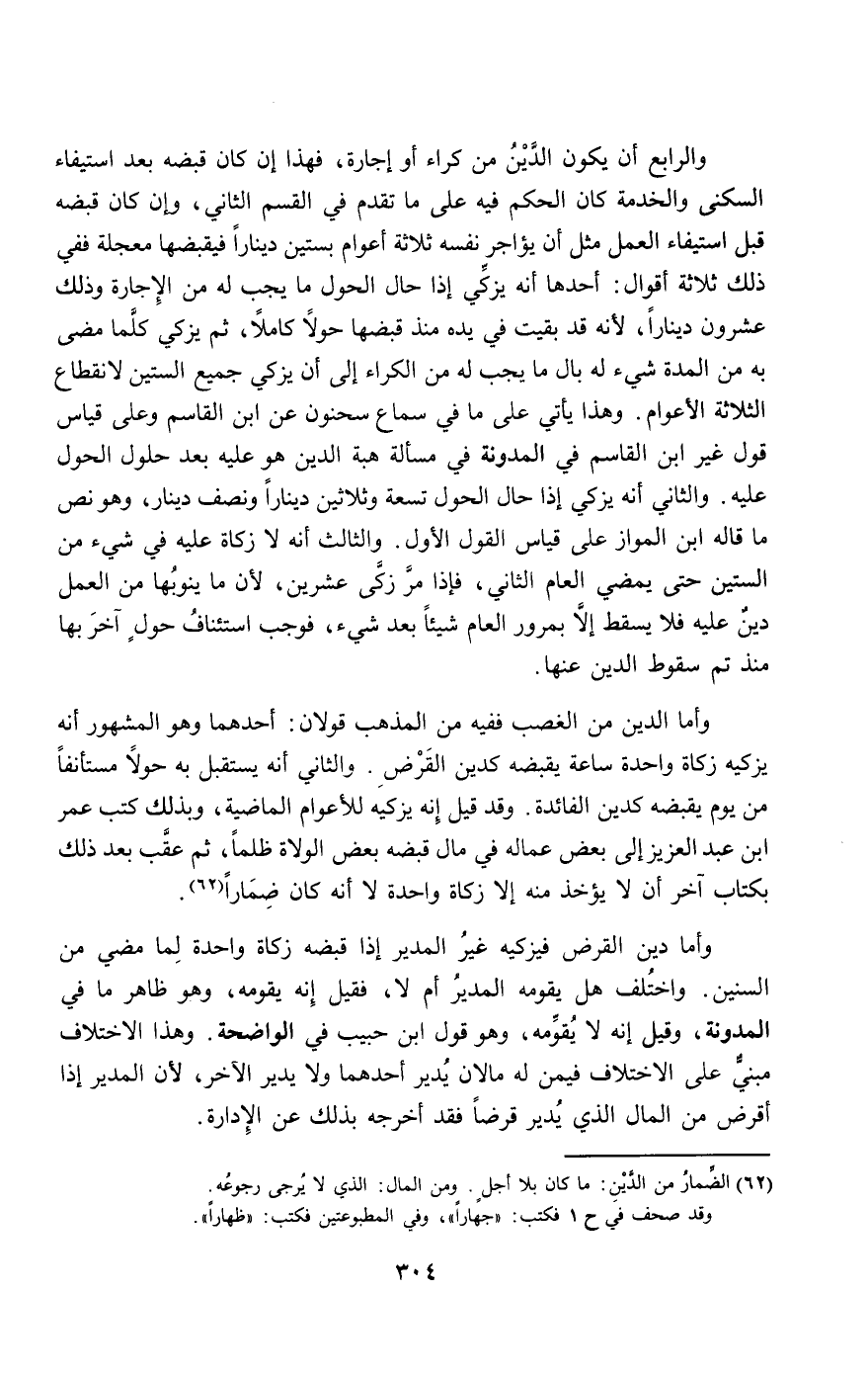 وأما الدين من الغصب ففيه من المذهب قولان: أحدهما وهو المشهور أنه يزكيه زكاة واحدة ساعة يقبضه كدين القرض. والثاني أنه يستقبل به حولا مستأنفا من يوم يقبضه كدين الفائدة. وقد قيل إنه يزكيه للأعوام الماضية، وبذلك كتب عمر ابن عبد العزيز إلى بعض عماله في مال قبضه بعض الولاة ظلما، ثم عقب بعد ذلك بكتاب آخر أن لا يؤخذ منه إلا زكاة واحدة لا أنه كان ضمارا.