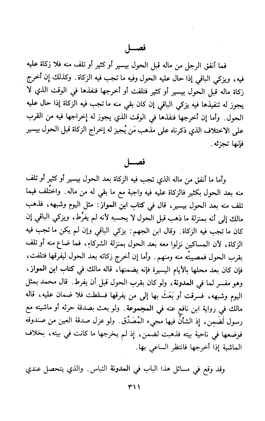 وأما ما أنفق من ماله الذي تجب فيه الزكاة بعد الحول بيسير أو كثير أو تلف منه بعد الحول بكثير فالزكاة عليه فيه واجبة مع ما بقي له من ماله. واختلف فيما تلف منه بعد الحول بيسير، قال في كتاب ابن المواز: مثل اليوم وشبهه، فذهب مالك إلى أنه بمنزلة ما ذهب قبل الحول لا يحسبه لأنه لم يفرط، ويزكي الباقي إن كان ما تجب فيه الزكاة. وقال ابن الجهم: يزكي الباقي وإن لم يكن ما تجب فيه الزكاة، لأن المساكين نزلوا معه بعد الحول بمنزلة الشركاء، فما ضاع منه أو تلف بقرب الحول فمصيبته منه ومنهم. وأما إن أخرج زكاته بعد الحول ليفرقها فتلفت، فإن كان بعد محلها بالأيام اليسيرة فإنه يضمنها، قاله مالك في كتاب ابن المواز، وهو مفسر لما في المدونة، ولو كان بقرب الحول قبل أن يفرط. قال محمد بمثل اليوم وشبهه، فسرقت أو بعث بها إلى من يفرقها فسقطت فلا ضمان عليه، قاله مالك في رواية ابن نافع عنه في المجموعة. ولو بعث بصدقة حرثه أو ماشيته مع رسول لضمن، إذ الشأن فيها مجيء المصدق. ولو عزل صدقة العين من صندوقه فوضعها في ناحية بيته فذهبت لضمن، إذ لم يخرجها ما كانت في بيته، بخلاف الماشية إذا أخرجها فانتظر الساعي بها.