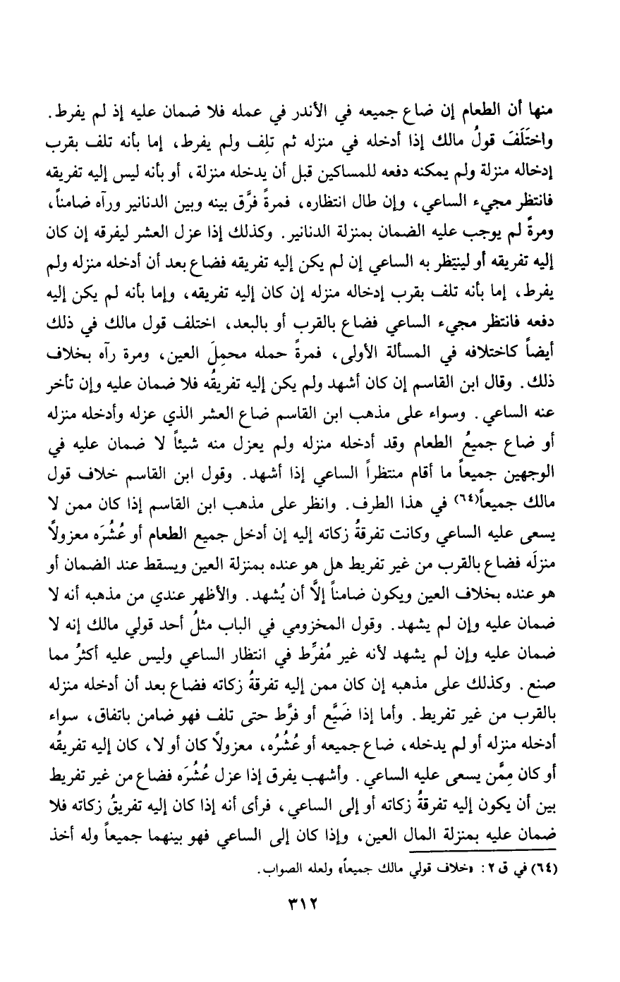 منها أن الطعام إن ضاع جميعه في الأندر في عمله فلا ضمان عليه إذ لم يفرط. واختلف قول مالك إذا أدخله في منزله ثم تلف ولم يفرط، إما بأنه تلف بقرب إدخاله منزله ولم يمكنه دفعه للمساكين قبل أن يدخله منزله، أو بأنه ليس إليه تفريقه فانتظر مجيء الساعي، وإن طال انتظاره، فمرة فرق بينه وبين الدنانير ورآه ضامنا، ومرة لم يوجب عليه الضمان بمنزلة الدنانير. وكذلك إذا عزل العشر ليفرقه إن كان إليه تفريقه أو لينتظر به الساعي إن لم يكن إليه تفريقه فضاع بعد أن أدخله منزله ولم يفرط، إما بأنه تلف بقرب إدخاله منزله إن كان إليه تفريقه، وإما بأنه لم يكن إليه دفعه فانتظر مجيء الساعي فضاع بالقرب أو بالبعد، اختلف قول مالك في ذلك أيضا كاختلافه في المسألة الأولى، فمرة حمله محمل العين، ومرة رآه بخلاف ذلك. وقال ابن القاسم إن كان أشهد ولم يكن إليه تفريقه فلا ضمان عليه وإن تأخر عنه الساعي. وسواء على مذهب ابن القاسم ضاع العشر الذي عزله وأدخله منزله أو ضاع جميع الطعام وقد أدخله منزله ولم يعزل منه شيئا لا ضمان عليه في الوجهين جميعا ما أقام منتظرا الساعي إذا أشهد. وقول ابن القاسم خلاف قول مالك جميعا في هذا الطرف. وانظر على مذهب ابن القاسم إذا كان ممن لا يسعى عليه الساعي وكانت تفرقة زكاته إليه إن أدخل جميع الطعام أو عشره معزولا منزله فضاع بالقرب من غير تفريط هل هو عنده بمنزلة العين ويسقط عند الضمان أو هو عنده بخلاف العين ويكون ضامنا إلا أن يشهد. والأظهر عندي من مذهبه أنه لا ضمان عليه دان لم يشهد. وقول المخزومي في الباب مثل أحد قولي مالك إنه لا ضمان عليه وإن لم يشهد لأنه غير مفرط في انتظار الساعي وليس عليه أكثر مما صنع. وكذلك على مذهبه إن كان ممن إليه تفرقة زكاته فضاع بعد أن أدخله منزله بالقرب من غير تفريط. وأما إذا ضيع أو فرط حتى تلف فهو ضامن باتفاق، سواء أدخله منزله أو لم يدخله، ضاع جميعه أو عشره، معزولا كان أو لا، كان إليه تفريقه أو كان ممن يسعى عليه الساعي. وأشهب يفرق إذا عزل عشره فضاع من غير تفريط بين أن يكون إليه تفرقة زكاته أو إلى الساعي، فرأى أنه إذا كان إليه تفريق زكاته فلا ضمان عليه بمنزلة المال العين، وإذا كان إلى الساعي فهو بينهما جميعا وله أخذ