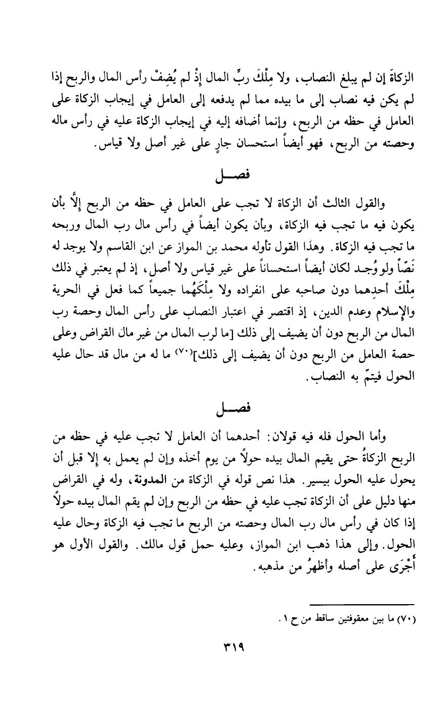 والقول الثالث أن الزكاة لا تجب على العامل في حظه من الربح إلا بأن يكون فيه ما تجب فيه الزكاة، وبأن يكون أيضا في رأس مال رب المال وربحه ما تجب فيه الزكاة. وهذا القول تأوله محمد بن المواز عن ابن القاسم ولا يوجد له نصا ولو وجد لكان أيضا استحسانا على غير قياس ولا أصل، إذ لم يعتبر في ذلك ملك أحدهما دون صاحبه على انفراده ولا ملكهما جميعا كما فعل في الحرية والإسلام وعدم الدين، إذ اقتصر في اعتبار النصاب على رأس المال وحصة رب المال من الربح دون أن يضيف إلى ذلك [ما لرب المال من غير مال القراض وعلى حصة العامل من الربح دون أن يضيف إلى ذلك]، ما له من مال قد حال عليه الحول فيتم به النصاب.