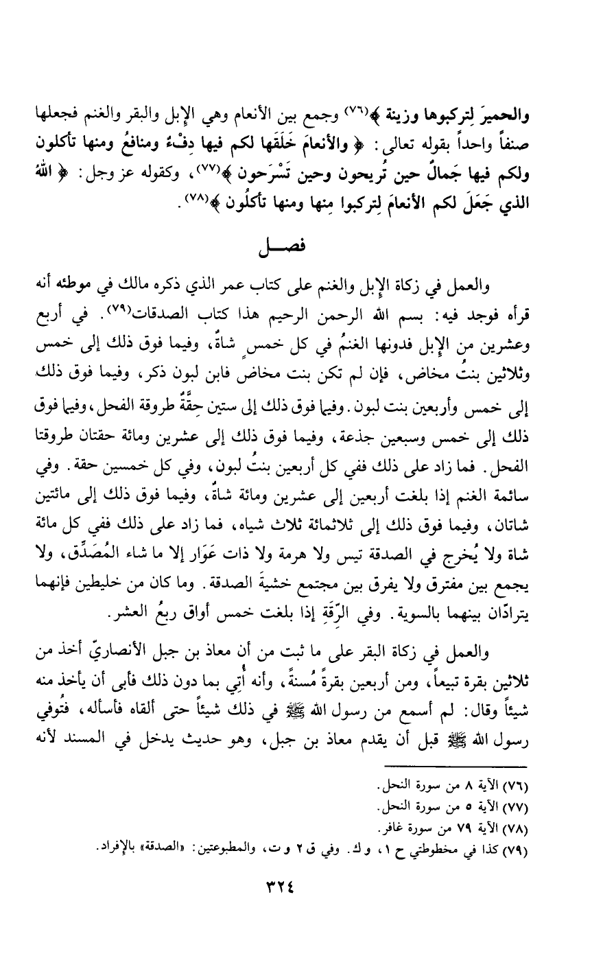 والعمل في زكاة البقر على ما ثبت من «أن معاذ بن جبل الأنصاري أخذ من ثلاثين بقرة تبيعا، ومن أربعين بقرة مسنة، وأنه أتي بما دون ذلك فأبى أن يأخذ منه شيئا وقال: لم أسمع من رسول الله - صَلَّى اللَّهُ عَلَيْهِ وَسَلَّمَ - في ذلك شيئا حتى ألقاه فأسأله، فتوفي رسول الله - صَلَّى اللَّهُ عَلَيْهِ وَسَلَّمَ - قبل أن يقدم معاذ بن جبل» وهو حديث يدخل في المسند لأنه