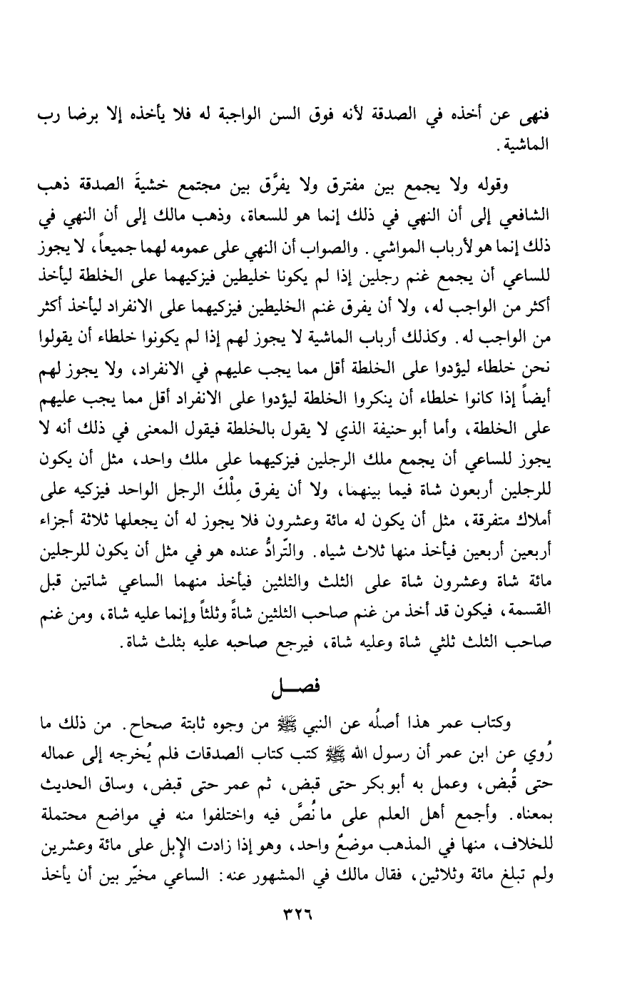 وقوله ولا يجمع بين مفترق ولا يفرق بين مجتمع خشية الصدقة ذهب الشافعي إلى أن النهي في ذلك إنما هو للسعاة، وذهب مالك إلى أن النهي في ذلك إنما هو لأرباب المواشي. والصواب أن النهي على عمومه لهما جميعا، لا يجوز للساعي أن يجمع غنم رجلين إذا لم يكونا خليطين فيزكيهما على الخلطة ليأخذ أكثر من الواجب له، ولا أن يفرق غنم الخليطين فيزكيهما على الانفراد ليأخذ أكثر من الواجب له. وكذلك أرباب الماشية لا يجوز لهم إذا لم يكونوا خلطاء أن يقولوا نحن خلطاء ليؤدوا على الخلطة أقل مما يجب عليهم في الانفراد، ولا يجوز لهم أيضا إذا كانوا خلطاء أن ينكروا الخلطة ليؤدوا على الانفراد أقل مما يجب عليهم على الخلطة، وأما أبو حنيفة الذي لا يقول بالخلطة فيقول المعنى في ذلك أنه لا يجوز للساعي أن يجمع ملك الرجلين فيزكيهما على ملك واحد، مثل أن يكون للرجلين أربعون شاة فيما بينهما، ولا أن يفرق ملك الرجل الواحد فيزكيه على أملاك متفرقة، مثل أن يكون له مائة وعشرون فلا يجوز له أن يجعلها ثلاثة أجزاء أربعين أربعين فيأخذ منها ثلاث شياه. والتراد عنده هو في مثل أن يكون للرجلين مائة شاة وعشرون شاة على الثلث والثلثين فيأخذ منهما الساعي شاتين قبل القسمة، فيكون قد أخذ من غنم صاحب الثلثين شاة وثلثا وإنما عليه شاة، ومن غنم صاحب الثلث ثلثي شاة وعليه شاة، فيرجع صاحبه عليه بثلث شاة.