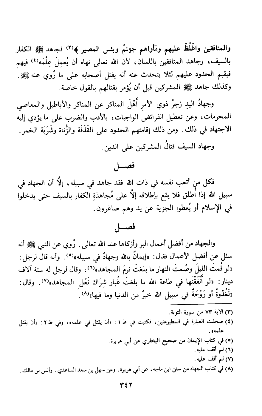 {يَا أَيُّهَا النَّبِيُّ جَاهِدِ الْكُفَّارَ وَالْمُنَافِقِينَ وَاغْلُظْ عَلَيْهِمْ وَمَأْوَاهُمْ جَهَنَّمُ وَبِئْسَ الْمَصِيرُ} [التوبة: 73] فجاهد - صَلَّى اللَّهُ عَلَيْهِ وَسَلَّمَ - الكفار بالسيف، وجاهد المنافقين باللسان، لأن الله تعالى نهاه أن يعمل علمه فيهم فيقيم الحدود عليهم لئلا يتحدث عنه أنه يقتل أصحابه على ما روي عنه - صَلَّى اللَّهُ عَلَيْهِ وَسَلَّمَ -. وكذلك جاهد - صَلَّى اللَّهُ عَلَيْهِ وَسَلَّمَ - المشركين قبل أن يؤمر بقتالهم بالقول خاصة.