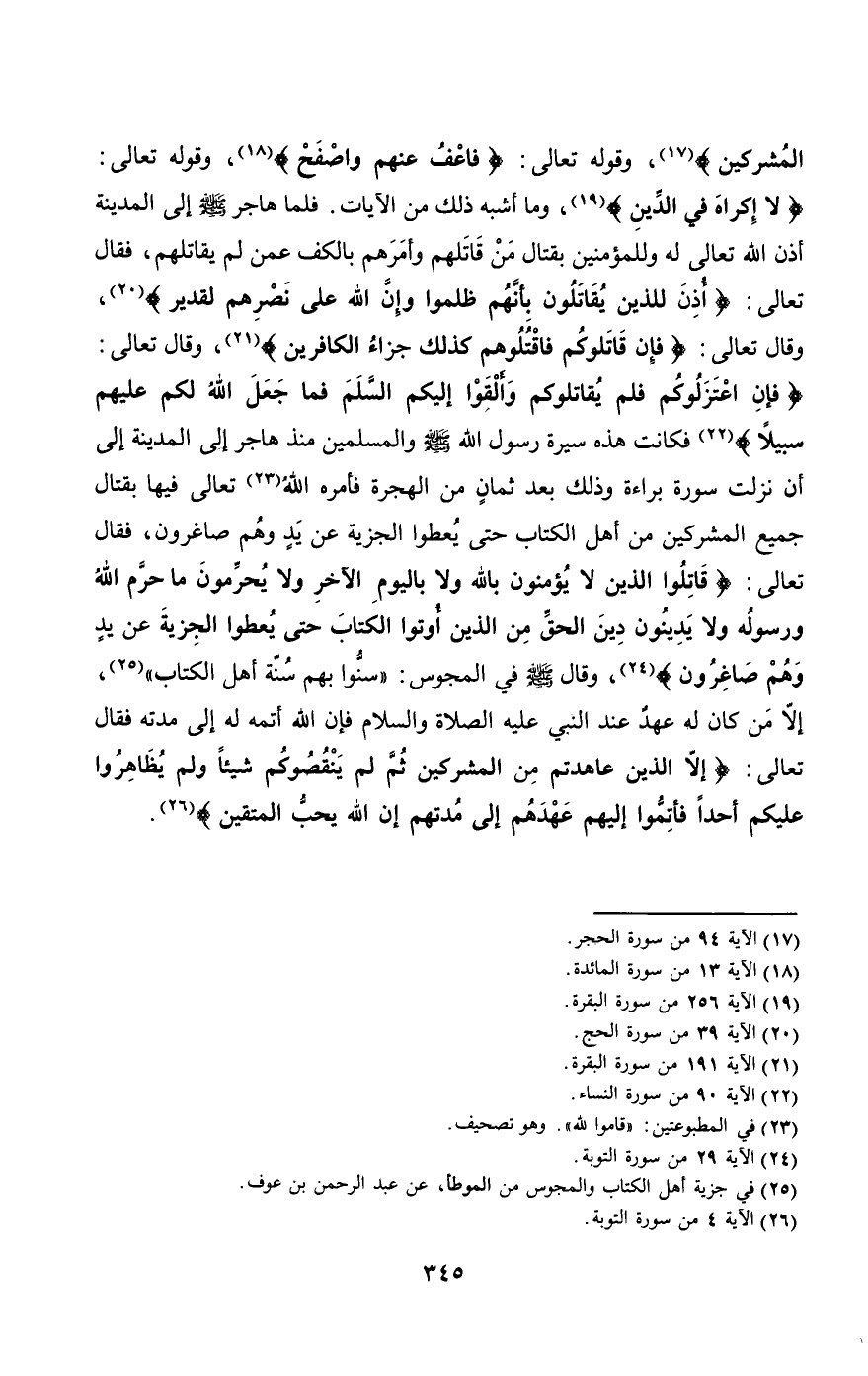 وقَوْله تَعَالَى: {فَاعْفُ عَنْهُمْ وَاصْفَحْ} [المائدة: 13]، وقَوْله تَعَالَى: {لا إِكْرَاهَ فِي الدِّينِ} [البقرة: 256]، وما أشبه ذلك من الآيات. فلما هاجر - صَلَّى اللَّهُ عَلَيْهِ وَسَلَّمَ - إلى المدينة أذن الله تعالى له وللمؤمنين بقتال من قاتلهم وأمرهم بالكف عمن لم يقاتلهم، فقال تعالى: {أُذِنَ لِلَّذِينَ يُقَاتَلُونَ بِأَنَّهُمْ ظُلِمُوا وَإِنَّ اللَّهَ عَلَى نَصْرِهِمْ لَقَدِيرٌ} [الحج: 39]، وقال تعالى: {فَإِنْ قَاتَلُوكُمْ فَاقْتُلُوهُمْ كَذَلِكَ جَزَاءُ الْكَافِرِينَ} [البقرة: 191]، وقال تعالى: {فَإِنِ اعْتَزَلُوكُمْ فَلَمْ يُقَاتِلُوكُمْ وَأَلْقَوْا إِلَيْكُمُ السَّلَمَ فَمَا جَعَلَ اللَّهُ لَكُمْ عَلَيْهِمْ سَبِيلا} [النساء: 90] فكانت هذه سيرة رسول الله - صَلَّى اللَّهُ عَلَيْهِ وَسَلَّمَ - والمسلمين منذ هاجر إلى المدينة إلى أن نزلت سورة براءة وذلك بعد ثمان من الهجرة فأمره الله تعالى فيها بقتال جميع المشركين من أهل الكتاب حتى يعطوا الجزية عن يد وهم صاغرون، فقال تعالى: {قَاتِلُوا الَّذِينَ لا يُؤْمِنُونَ بِاللَّهِ وَلا بِالْيَوْمِ الآخِرِ وَلا يُحَرِّمُونَ مَا حَرَّمَ اللَّهُ وَرَسُولُهُ وَلا يَدِينُونَ دِينَ الْحَقِّ مِنَ الَّذِينَ أُوتُوا الْكِتَابَ حَتَّى يُعْطُوا الْجِزْيَةَ عَنْ يَدٍ وَهُمْ صَاغِرُونَ} [التوبة: 29]، وقال - صَلَّى اللَّهُ عَلَيْهِ وَسَلَّمَ - في المجوس: «سنوا بهم سنة أهل الكتاب»، إلا من كان له عهد عند النبي - عَلَيْهِ الصَّلَاةُ وَالسَّلَامُ - فإن الله أتمه له إلى مدته فقال تعالى: {إِلا الَّذِينَ عَاهَدْتُمْ مِنَ الْمُشْرِكِينَ ثُمَّ لَمْ يَنْقُصُوكُمْ شَيْئًا وَلَمْ يُظَاهِرُوا عَلَيْكُمْ أَحَدًا فَأَتِمُّوا إِلَيْهِمْ عَهْدَهُمْ إِلَى مُدَّتِهِمْ إِنَّ اللَّهَ يُحِبُّ الْمُتَّقِينَ} [التوبة: 4].