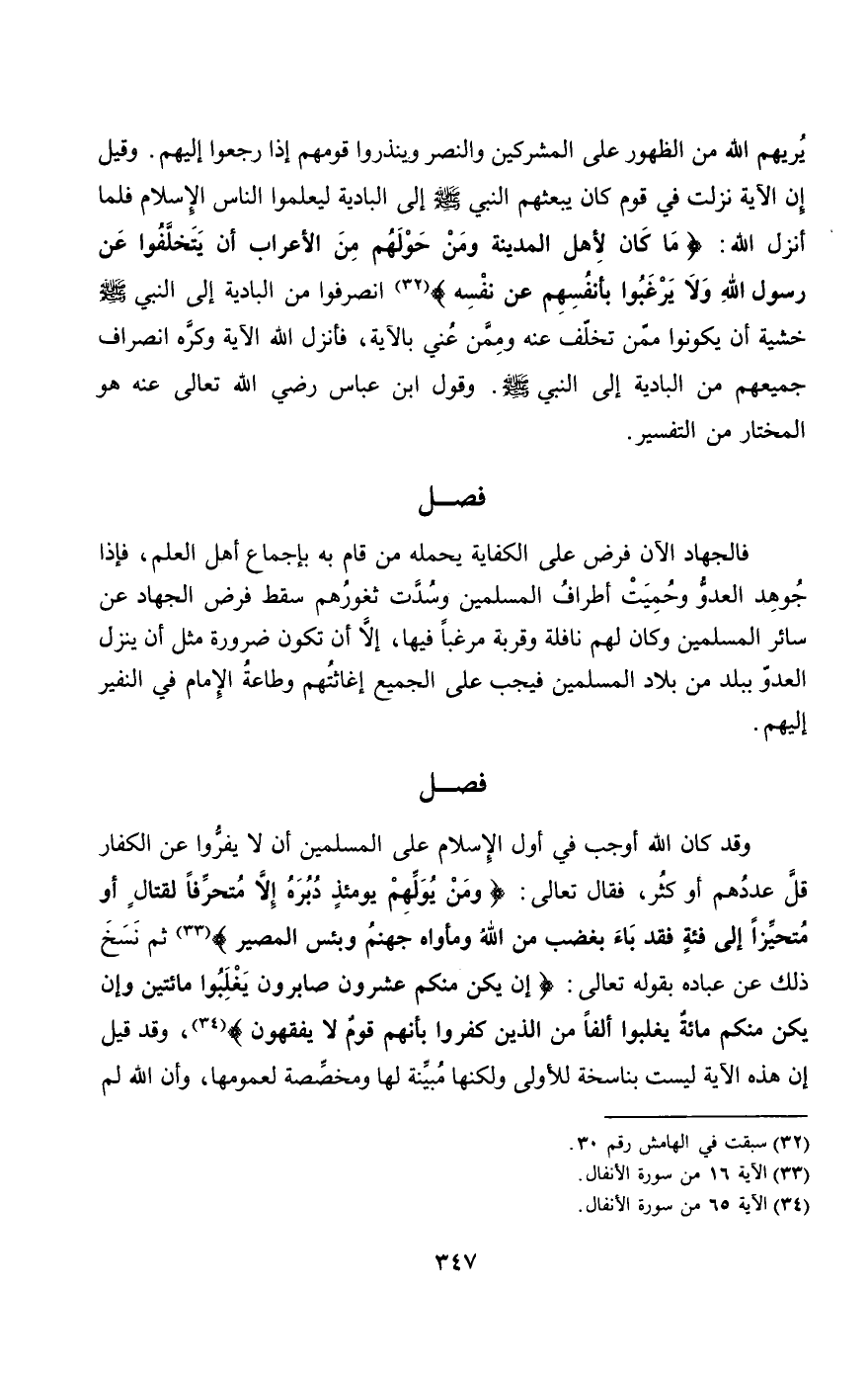 وقد كان الله أوجب في أول الإسلام على المسلمين أن لا يفروا عن الكفار قل عددهم أو كثر، فقال تعالى: {وَمَنْ يُوَلِّهِمْ يَوْمَئِذٍ دُبُرَهُ إِلا مُتَحَرِّفًا لِقِتَالٍ أَوْ مُتَحَيِّزًا إِلَى فِئَةٍ فَقَدْ بَاءَ بِغَضَبٍ مِنَ اللَّهِ وَمَأْوَاهُ جَهَنَّمُ وَبِئْسَ الْمَصِيرُ} [الأنفال: 16] ثم نسخ ذلك عن عباده بقوله تعالى: {إِنْ يَكُنْ مِنْكُمْ عِشْرُونَ صَابِرُونَ يَغْلِبُوا مِائَتَيْنِ وَإِنْ يَكُنْ مِنْكُمْ مِائَةٌ يَغْلِبُوا أَلْفًا مِنَ الَّذِينَ كَفَرُوا بِأَنَّهُمْ قَوْمٌ لا يَفْقَهُونَ} [الأنفال: 65]، وقد قيل إن هذه الآية ليست بناسخة للأولى ولكنها مبينة لها ومخصصة لعمومها، وأن الله لم