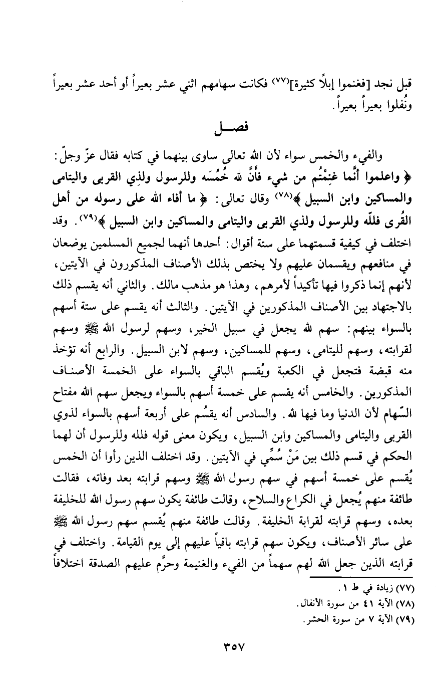 والفيء والخمس سواء لأن الله تعالى ساوى بينهما في كتابه فقال عز وجل: {وَاعْلَمُوا أَنَّمَا غَنِمْتُمْ مِنْ شَيْءٍ فَأَنَّ لِلَّهِ خُمُسَهُ وَلِلرَّسُولِ وَلِذِي الْقُرْبَى وَالْيَتَامَى وَالْمَسَاكِينِ وَابْنِ السَّبِيلِ} [الأنفال: 41] وقال تعالى: {مَا أَفَاءَ اللَّهُ عَلَى رَسُولِهِ مِنْ أَهْلِ الْقُرَى فَلِلَّهِ وَلِلرَّسُولِ وَلِذِي الْقُرْبَى وَالْيَتَامَى وَالْمَسَاكِينِ وَابْنِ السَّبِيلِ} [الحشر: 7]. وقد اختلف في كيفية قسمتهما على ستة أقوال: أحدها أنهما لجميع المسلمين يوضعان في منافعهم ويقسمان عليهم ولا يختص بذلك الأصناف المذكورون في الآيتين، لأنهم إنما ذكروا فيها تأكيدا لأمرهم، وهذا هو مذهب مالك. والثاني أنه يقسم ذلك بالاجتهاد بين الأصناف المذكورين في الآيتين. والثالث أنه يقسم على ستة أسهم بالسواء بينهم: سهم لله يجعل في سبيل الخير، وسهم لرسول الله - صَلَّى اللَّهُ عَلَيْهِ وَسَلَّمَ - وسهم لقرابته، وسهم لليتامى، وسهم للمساكين، وسهم لابن السبيل. والرابع أنه تؤخذ منه قبضة فتجعل في الكعبة ويقسم الباقي بالسواء على الخمسة الأصناف المذكورين. والخامس أنه يقسم على خمسة أسهم بالسواء ويجعل سهم الله مفتاح السهام لأن الدنيا وما فيها لله. والسادس أنه يقسم على أربعة أسهم بالسواء لذوي القربى واليتامى والمساكين وابن السبيل، ويكون معنى قوله فلله وللرسول أن لهما الحكم في قسم ذلك بين من سمي في الآيتين. وقد اختلف الذين رأوا أن الخمس يقسم على خمسة أسهم في سهم رسول الله - صَلَّى اللَّهُ عَلَيْهِ وَسَلَّمَ - وسهم قرابته بعد وفاته، فقالت طائفة منهم يجعل في الكراع والسلاح، وقالت طائفة يكون سهم رسول الله للخليفة بعده، وسهم قرابته لقرابة الخليفة. وقالت طائفة منهم يقسم سهم رسول الله - صَلَّى اللَّهُ عَلَيْهِ وَسَلَّمَ - على سائر الأصناف، ويكون سهم قرابته باقيا عليهم إلى يوم القيامة. واختلف في قرابته الذين جعل الله لهم سهما من الفيء والغنيمة وحرم عليهم الصدقة اختلافا