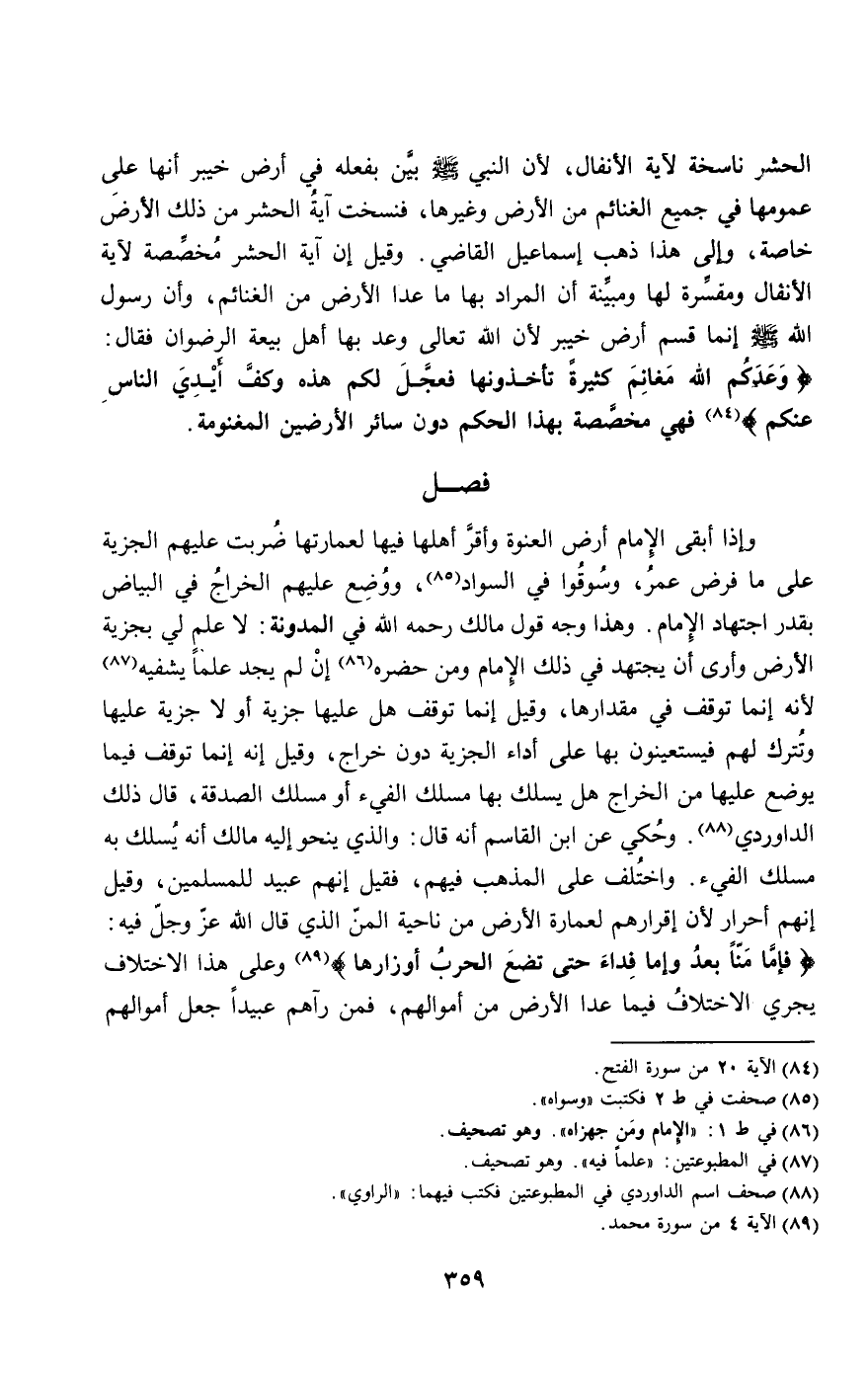 الحشر ناسخة لآية الأنفال، لأن النبي - صَلَّى اللَّهُ عَلَيْهِ وَسَلَّمَ - بين بفعله في أرض خيبر أنها على عمومها في جميع الغنائم من الأرض وغيرها، فنسخت آية الحشر من ذلك الأرض خاصة، وإلى هذا ذهب إسماعيل القاضي. وقيل إن آية الحشر مخصصه لآية الأنفال ومفسرة لها ومبينة أن المراد بها ما عدا الأرض من الغنائم، وأن رسول الله - صَلَّى اللَّهُ عَلَيْهِ وَسَلَّمَ - إنما قسم أرض خيبر لأن الله تعالى وعد بها أهل بيعة الرضوان فقال: {وَعَدَكُمُ اللَّهُ مَغَانِمَ كَثِيرَةً تَأْخُذُونَهَا فَعَجَّلَ لَكُمْ هَذِهِ وَكَفَّ أَيْدِيَ النَّاسِ عَنْكُمْ} [الفتح: 20] فهي مخصصة بهذا الحكم دون سائر الأرضين المغنومة.