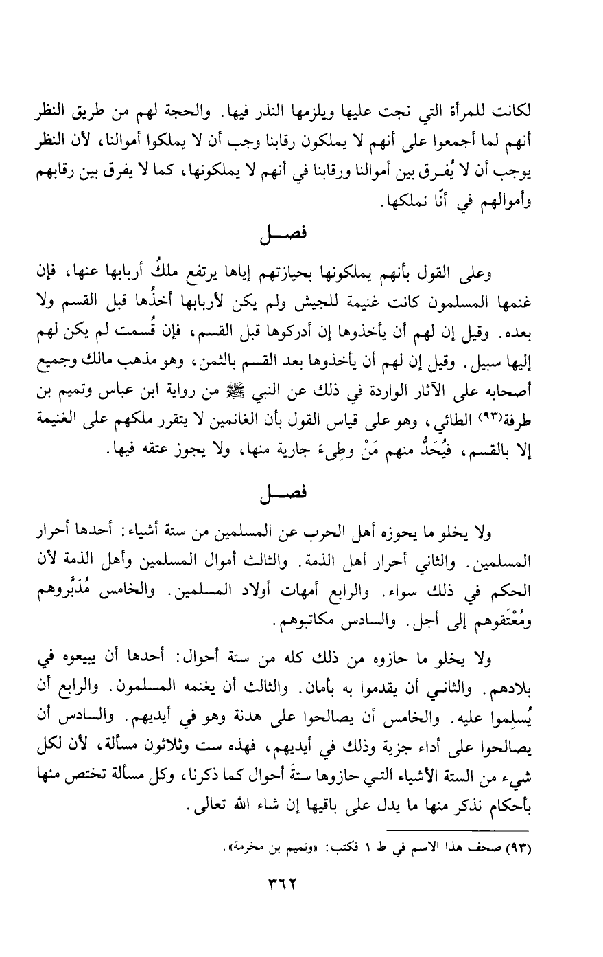 ولا يخلو ما يحوزه أهلك الحرب عن المسلمين من ستة أشياء: أحدها أحرار المسلمين. والثاني أحرار أهل الذمة. والثالث أموال المسلمين وأهل الذمة لأن الحكم في ذلك سواء. والرابع أمهات أولاد المسلمين. والخامس مدبروهم ومعتقوهم إلى أجل. والسادس مكاتبوهم.