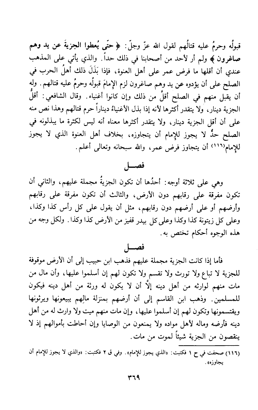 قبوله وحرم عليه قتالهم لقول الله عز وجل: {حَتَّى يُعْطُوا الْجِزْيَةَ عَنْ يَدٍ وَهُمْ صَاغِرُونَ} [التوبة: 29] ولم أر لأحد من أصحابنا في ذلك حدا. والذي يأتي على المذهب عندي أن أقلها ما فرض عمر على أهل العنوة، فإذا بذل ذلك أهل الحرب في الصلح على أن يؤدوه عن يد وهم صاغرون لزم الإمام قبوله وحرم عليه قتالهم. وله أن يقبل منهم في الصلح أقل من ذلك وإن كانوا أغنياء وقال الشافعي: أقل الجزية دينار، ولا يتقدر أكثرها لأنه إذا بذل الأغنياء دينارا حرم قتالهم وهذا نص منه على أن أقل الجزية دينار، ولا يتقدر أكثرها معناه أنه ليس لكثرة ما يبذلونه في الصلح حد لا يجوز للإمام أن يتجاوزه، بخلاف أهل العنوة الذي لا يجوز للإمام أن يتجاوز فرض عمر، والله سبحانه وتعالى أعلم.