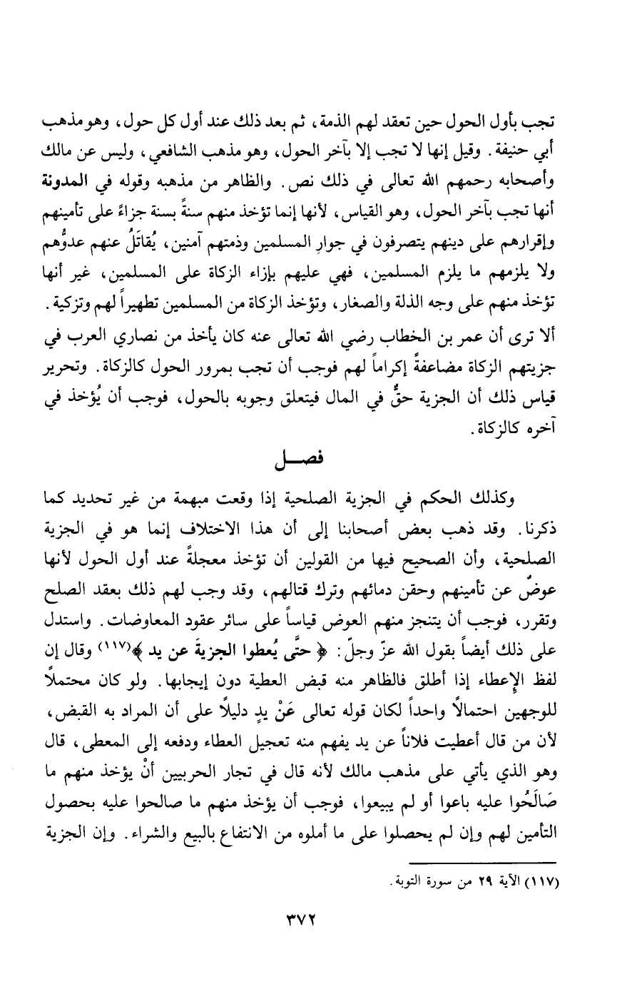 وكذلك الحكم في الجزية الصلحية إذا وقعت مبهمة من غير تحديد كما ذكرنا. وقد ذهب بعض أصحابنا إلى أن هذا الاختلاف إنما هو في الجزية الصلحية، وأن الصحيح فيها من القولين أن تؤخذ معجلة عند أول الحول لأنها عوض عن تأمينهم وحقن دمائهم وترك قتالهم، وقد وجب لهم ذلك بعقد الصلح وتقرر، فوجب أن يتنجز منهم العوض قياسا على سائر عقود المعاوضات. واستدل على ذلك أيضا بقول الله عز وجل: {حَتَّى يُعْطُوا الْجِزْيَةَ عَنْ يَدٍ} [التوبة: 29] وقال إن لفظ الإعطاء إذا أطلق فالظاهر منه قبض العطية دون إيجابها. ولو كان محتملا للوجهين احتمالا واحدا لكان قَوْله تَعَالَى عن يد دليلا على أن المراد به القبض، لأن من قال أعطيت فلانا عن يد يفهم منه تعجيل العطاء ودفعه إلى المعطى، قال وهو الذي يأتي على مذهب مالك لأنه قال في تجار الحربيين أن يؤخذ منهم ما صالحوا عليه باعوا أو لم يبيعوا، فوجب أن يؤخذ منهم ما صالحوا عليه بحصول التأمين لهم وإن لم يحصلوا على ما أملوه من الانتفاع بالبيع والشراء. وإن الجزية