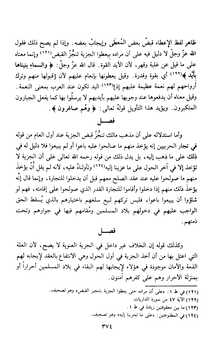 ظاهر لفظ الإعطاء قبض بعض المعطى وإيجاب بعضه. وإذا لم يصح ذلك فقول الله عز وجل لا دليل فيه على أن مراده بيعطوا الجزية تنجز القبض وإنما معناه على ما قيل عن غلبة وقهر، لأن الأيد القوة. قال الله عز وجل: {وَالسَّمَاءَ بَنَيْنَاهَا بِأَيْدٍ} [الذاريات: 47] أي بقوة وقدرة. وليل يعطونها بإنعام عليهم لأن [قبولها منهم وترك أرواحهم لهم نعمة عظيمة عليهم إذ]، اليد تكون عند العرب بمعنى النعمة. وقيل معناه أن يدفعوها عند وجوبها عليهم بأيديهم لا يرسلوا بها كما يفعل الجبارون المتكبرون. ويؤيد هذا التأويل قَوْله تَعَالَى: {وَهُمْ صَاغِرُونَ} [التوبة: 29].