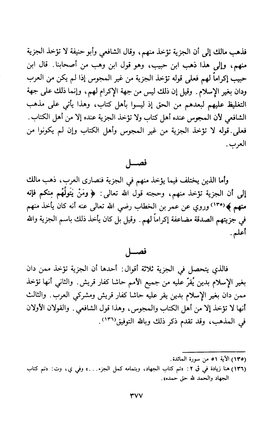 وأما الذين يختلف فيما يؤخذ منهم في الجزية فنصارى العرب، ذهب مالك إلى أن الجزية تؤخذ منهم، وحجته قول الله تعالى: {وَمَنْ يَتَوَلَّهُمْ مِنْكُمْ فَإِنَّهُ مِنْهُمْ} [المائدة: 51] وروي عن عمر بن الخطاب - رَضِيَ اللَّهُ تَعَالَى عَنْهُ - أنه كان يأخذ منهم في جزيتهم الصدقة مضاعفة إكراما لهم. وقيل بل كان يأخذ ذلك باسم الجزية والله أعلم.