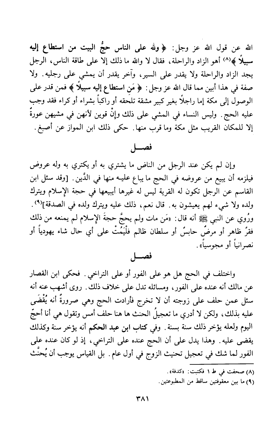 وإن لم يكن عند الرجل من الناض ما يشتري به أو يكتري به وله عروض فيلزمه أن يبيع من عروضه في الحج ما يباع عليه منها في الدين. أوقد سئل ابن القاسم عن الرجل تكون له القرية ليس له غيرها أيبيعها في حجة الإسلام ويترك ولده ولا شيء لهم يعيشون به. قال نعم، ذلك عليه ويترك ولده في الصدقة،. وروي عن النبي - صَلَّى اللَّهُ عَلَيْهِ وَسَلَّمَ - أنه قال: «من مات ولم يحج حجة الإسلام لم يمنعه من ذلك فقر ظاهر أو مرض حابس أو سلطان ظالم فليمت على أي حال شاء يهوديا أو نصرانيا أو مجوسيا».