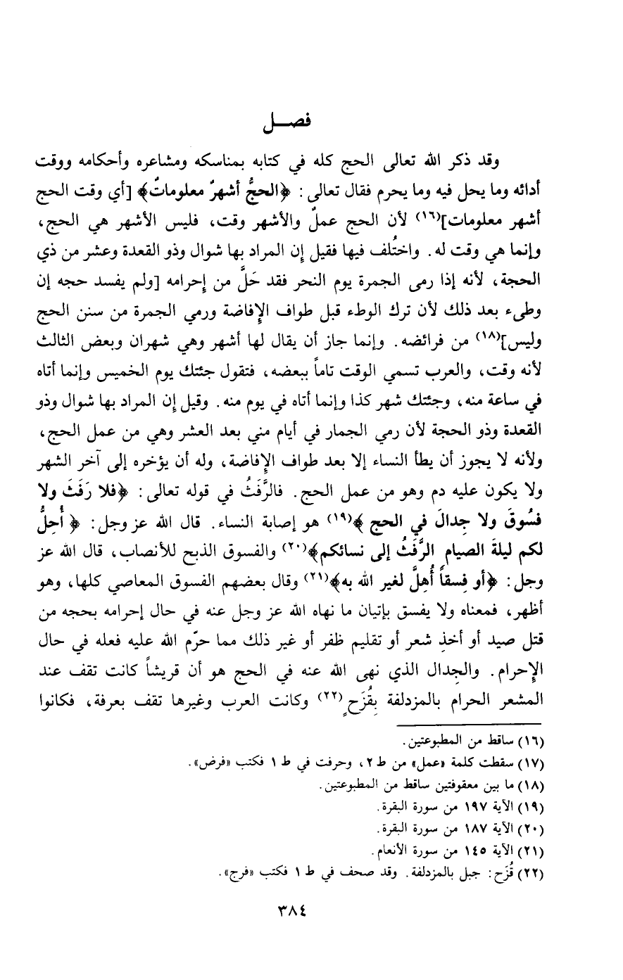 وقد ذكر الله تعالى الحج كله في كتابه بمناسكه ومشاعره وأحكامه ووقت أدائه وما يحل فيه وما يحرم فقال تعالى: {الْحَجُّ أَشْهُرٌ مَعْلُومَاتٌ} [البقرة: 197] [أي وقت الحج أشهر معلومات] لأن الحج عمل والأشهر وقت، فليس الأشهر هي الحج، وإنما هي وقت له. واختلف فيها فقيل إن المراد بها شوال وذو القعدة وعشر من ذي الحجة، لأنه إذا رمى الجمرة يوم النحر فقد حل من إحرامه أولم يفسد حجه إن وطئ بعد ذلك لأن ترك الوطء قبل طواف الإفاضة ورمي الجمرة من سنن الحج وليس من فرائضه. وإنما جاز أن يقال لها أشهر وهي شهران وبعض الثالث لأنه وقت، والعرب تسمي الوقت تاما ببعضه، فتقول جئتك يوم الخميس وإنما أتاه في ساعة منه، وجئتك شهر كذا وإنما أتاه في يوم منه. وقيل إن المراد بها شوال وذو القعدة وذو الحجة لأن رمي الجمار في أيام مني بعد العشر وهي من عمل الحج، ولأنه لا يجوز أن يطأ النساء إلا بعد طواف الإفاضة، وله أن يؤخره إلى آخر الشهر ولا يكون عليه دم وهو من عمل الحج. فالرفث في قَوْله تَعَالَى: {فَلا رَفَثَ وَلا فُسُوقَ وَلا جِدَالَ فِي الْحَجِّ} [البقرة: 197] هو إصابة النساء. قال الله عز وجل: {أُحِلَّ لَكُمْ لَيْلَةَ الصِّيَامِ الرَّفَثُ إِلَى نِسَائِكُمْ} [البقرة: 187] والفسوق الذبح للأنصاب، قال الله عز وجل: {أَوْ فِسْقًا أُهِلَّ لِغَيْرِ اللَّهِ بِهِ} [الأنعام: 145] وقال بعضهم الفسوق المعاصي كلها، وهو أظهر، فمعناه ولا يفسق بإتيان ما نهاه الله عز وجل عنه في حال إحرامه بحجه من قتل صيد أو أخذ شعر أو تقليم ظفر أو غير ذلك مما حرم الله عليه فعله في حال الإحرام. والجدال الذي نهى الله عنه في الحج هو أن قريشا كانت تقف عند المشعر الحرام بالمزدلفة بقزح وكانت العرب وغيرها تقف بعرفة، فكانوا