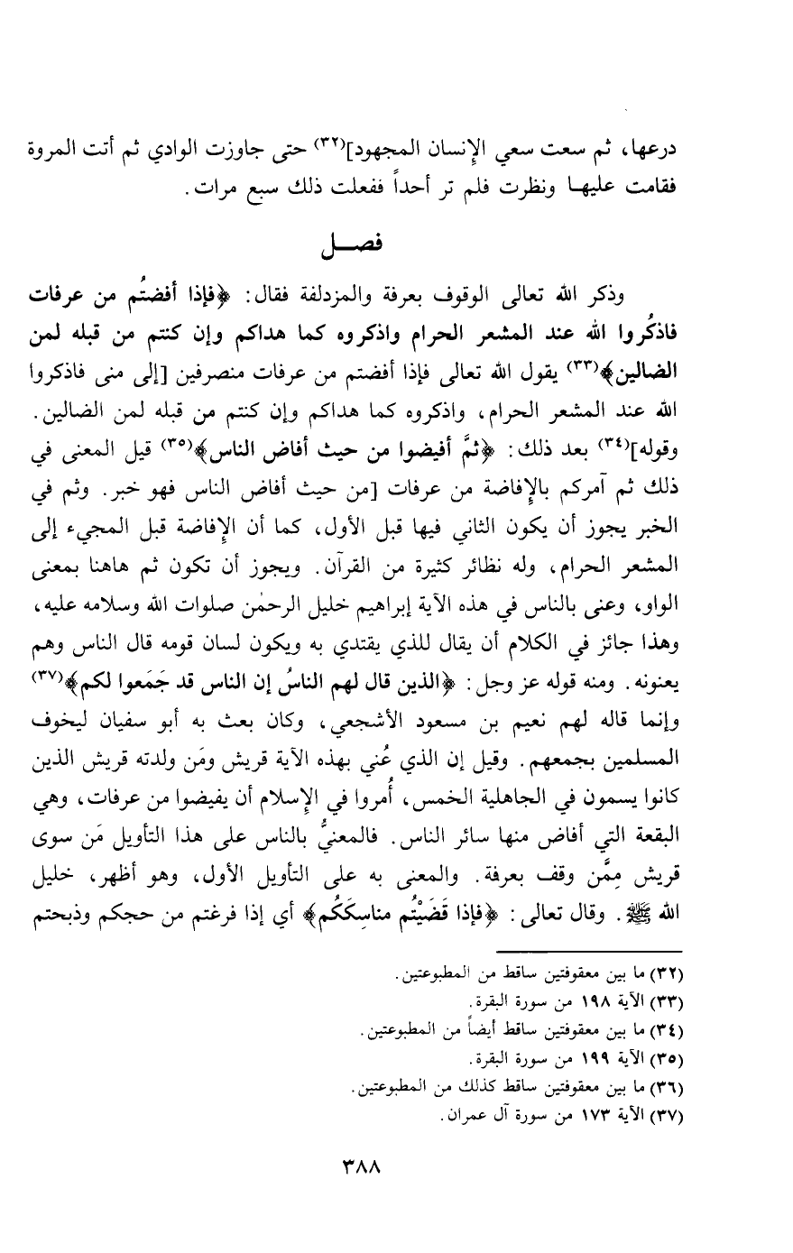 وذكر الله تعالى الوقوف بعرفة والمزدلفة فقال: {فَإِذَا أَفَضْتُمْ مِنْ عَرَفَاتٍ فَاذْكُرُوا اللَّهَ عِنْدَ الْمَشْعَرِ الْحَرَامِ وَاذْكُرُوهُ كَمَا هَدَاكُمْ وَإِنْ كُنْتُمْ مِنْ قَبْلِهِ لَمِنَ الضَّالِّينَ} [البقرة: 198] يقول الله تعالى فإذا أفضتم من عرفات منصرفين [إلى منى فاذكروا الله عند المشعر الحرام، واذكروه كما هداكم وإن كنتم من قبله لمن الضالين. وقوله]، بعد ذلك: {ثُمَّ أَفِيضُوا مِنْ حَيْثُ أَفَاضَ النَّاسُ} [البقرة: 199] قيل: المعنى في ذلك ثم آمركم بالإفاضة من عرفات من حيث أفاض الناس فهو خبر. وثم في الخبر يجوز أن يكون الثاني فيها قبل الأول، كما أن الإفاضة قبل المجيء إلى المشعر الحرام، وله نظائر كثيرة من القرآن. ويجوز أن تكون ثم هاهنا بمعنى الواو، وعنى بالناس في هذه الآية إبراهيم خليل الرحمن - صَلَوَاتُ اللَّهِ وَسَلَامُهُ عَلَيْهِ -، وهذا جائز في الكلام أن يقال للذي يقتدى به ويكون لسان قومه قال الناس وهم يعنونه. ومنه قوله عز وجل: {الَّذِينَ قَالَ لَهُمُ النَّاسُ إِنَّ النَّاسَ قَدْ جَمَعُوا لَكُمْ} [آل عمران: 173] وإنما قاله لهم نعيم بن مسعود الأشجعي، وكان بعث به أبو سفيان ليخوف المسلمين بجمعهم. وقيل: إن الذي عني بهذه الآية قريش ومن ولدته قريش الذين كانوا يسمون في الجاهلية الخمس، أمروا في الإسلام أن يفيضوا من عرفات، وهي البقعة التي أفاض منها سائر الناس. فالمعنى بالناس على هذا التأويل من سوى قريش ممن وقف بعرفة. والمعنى به على التأويل الأول، وهو أظهر، خليل الله - صَلَّى اللَّهُ عَلَيْهِ وَسَلَّمَ -. وقال تعالى: {فَإِذَا قَضَيْتُمْ مَنَاسِكَكُمْ} [البقرة: 200] أي إذا فرغتم من حجكم وذبحتم