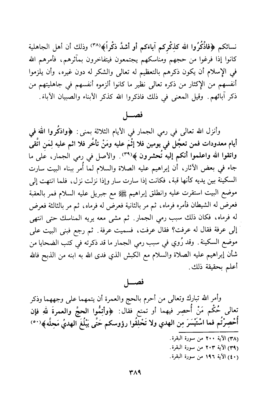 وأنزل الله تعالى في رمي الجمار في الأيام الثلاثة بمنى: {وَاذْكُرُوا اللَّهَ فِي أَيَّامٍ مَعْدُودَاتٍ فَمَنْ تَعَجَّلَ فِي يَوْمَيْنِ فَلا إِثْمَ عَلَيْهِ وَمَنْ تَأَخَّرَ فَلا إِثْمَ عَلَيْهِ لِمَنِ اتَّقَى وَاتَّقُوا اللَّهَ وَاعْلَمُوا أَنَّكُمْ إِلَيْهِ تُحْشَرُونَ} [البقرة: 203]. والأصل في رمي الجمار، على ما جاء في بعض الآثار، «أن إبراهيم - عَلَيْهِ الصَّلَاةُ وَالسَّلَامُ - لما أمر ببناء البيت سارت السكينة بين يديه كأنها قبة، فكانت إذا سارت سار وإذا نزلت نزل، فلما انتهت إلى موضع البيت استقرت عليه وانطلق إبراهيم - صَلَّى اللَّهُ عَلَيْهِ وَسَلَّمَ - مع جبريل - عَلَيْهِ السَّلَامُ - فمر بالعقبة فعرض له الشيطان فأمره فرماه، ثم مر بالثانية فعرض له فرماه، ثم مر بالثالثة فعرض له فرماه، فكان ذلك سبب رمي الجمار. ثم مشى معه يريه المناسك حتى انتهى إلى عرفة فقال له عرفت؟ فقال عرفت، فسميت عرفة. ثم رجع فبنى البيت على موضع السكينة». وقد روي في سبب رمي الجمار ما قد ذكرته في كتب الضحايا من شأن إبراهيم - عَلَيْهِ الصَّلَاةُ وَالسَّلَامُ - مع الكبش الذي فدى الله به ابنه من الذبح فالله أعلم بحقيقة ذلك.